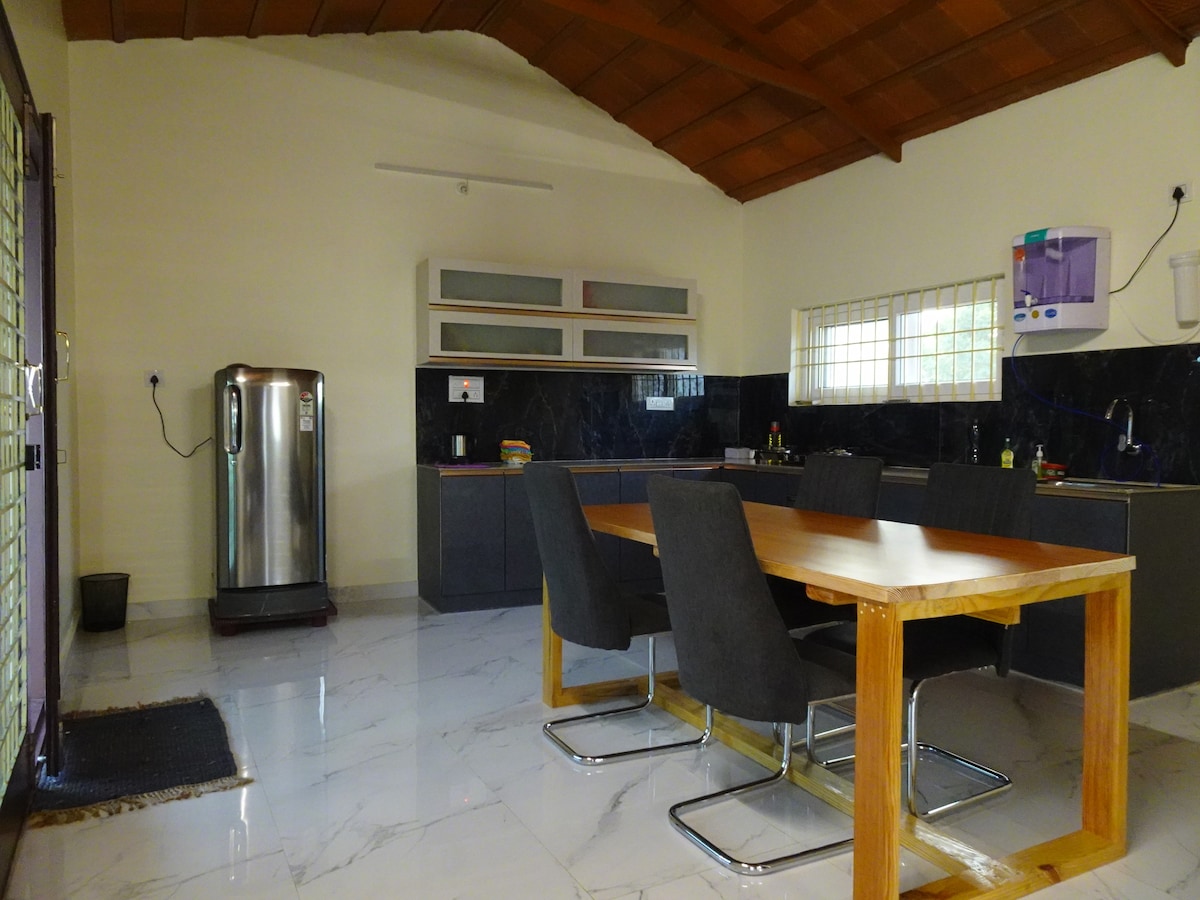 Évadez-vous à Samruddhi Food Forest, une ferme biologique de 3 hectares à Doddaballapura, où nous cultivons une variété de produits en utilisant des techniques agricoles durables. La ferme, ornée d'arbres indiens indigènes, est un sanctuaire idyllique pour les adeptes de la nature. Réveillez-vous avec le chant des oiseaux dans notre villa 4 BHK soigneusement conçue et adaptée aux animaux de compagnie. Notre cuisine entièrement équipée est à votre entière disposition pour les aventures culinaires. Des frais d'utilisation de 500 ₹ s'appliquent. Swiggy/Zomato est également une option. Solaire, UPS, Gen-set équipé.