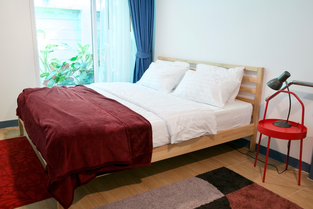 (réduction au mois) Maison individuelle unique avec jardin dans le quartier de Huaykwang/Ladprao. L'ensemble du logement dispose d'une chambre, d'un salon, d'un patio et de toilettes. Nous offrons un transfert aéroport gratuit, il suffit de nous en informer. Nous avons une nouvelle chambre et un salon élégants meublés avec des meubles iKea et une chaise de travail adaptée à tous ceux qui viennent visiter Bangkok et WFA avec une vitesse de wifi de plus de 300 mbps. Notre chambre familiale est également adaptée aux personnes âgées grâce à la barre d'appui qui relie le lit à la salle de bain.