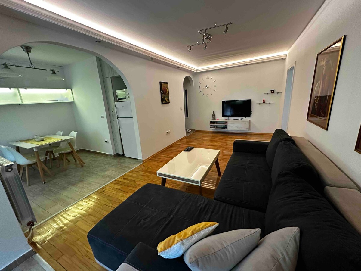 Profitez d'un logement élégant et central. Il s'agit d'un NOUVEL appartement de 60 m2 à 5 minutes à pied du parc de la ville (stade) et de la place principale. Meilleur emplacement possible, très proche des belles rues de Debar Maalo avec de nombreux bars et restaurants. L'appartement comprend 1 chambre avec lit Queen Size et un salon avec canapé convertible confortable + lit gigogne. Également 2 balcons depuis les deux chambres, l'un donnant sur la montagne Vodno. Vous pouvez l'utiliser pour boire un café ou déjeuner.