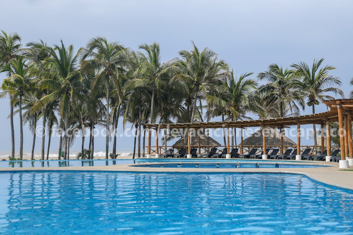 PUNTA DIAMANTE Condo super exclusif sur la plage 5o P Séjour immense avec VUE SUR LA MER 2 Rec avec 2 lits Mat chacun + canapé-lit Mat, terrasse meublée, TV 86" Netflix, Climatisation WI FI 100 M, palapa exclusive sur la plage, jacuzzi dans la piscine, jeux pour enfants aquatiques, snack-bar week-end et haute saison, check in 24 hrs 1 parking coût bracelet identification 150 $ pesos Mex payé en administration, près des supermarchés, golf- Tennis restaurants bars ATTENTION LILIA ET JORGE