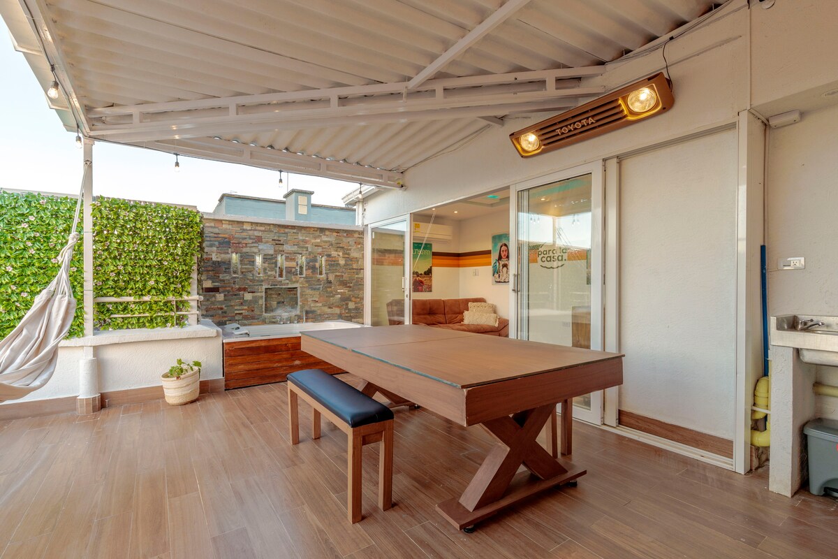 Penthouse avec jacuzzi et terrasse privée, table de billard et ping-pong, barbecue au baril, une Xbox pour les amateurs de jeux vidéo. Il dispose d'une salle de cinéma privée avec canapé-lit adaptable dans une chambre . Il dispose de 4 chambres spacieuses, de 3 salles de bains élégantes et d'un toit privé parfait pour profiter d'une vue, de réunions ou de barbecues. Idéal pour les groupes ou familles à la recherche de luxe, de confort et de plaisir en un seul endroit. Il est en face du centre commercial de Villa Carolina.