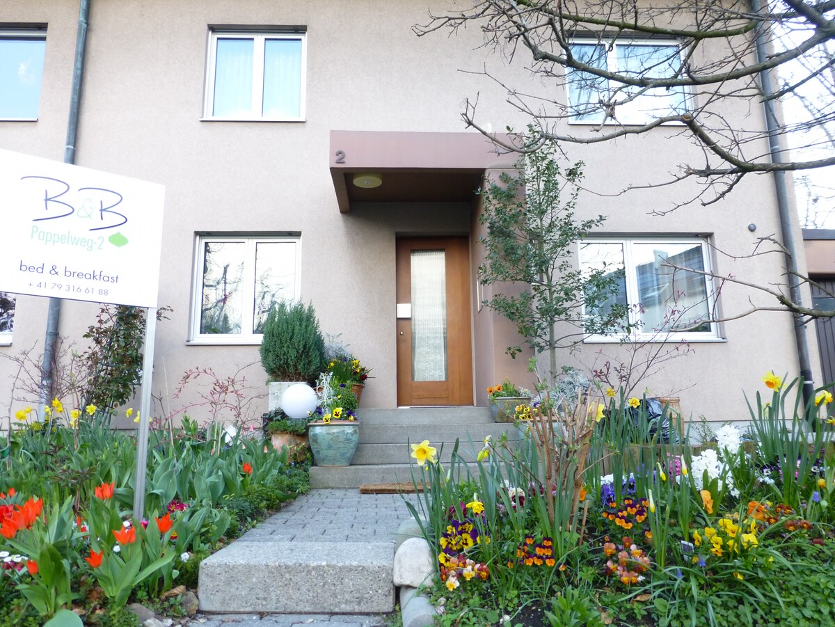 Notre chambre d'hôtes est calme, propre et bien aménagée. B&B "chez nous" est dans une rue calme de Bâle, en 18 min. vous atteignez le centre de Bâle par le bus 33. Le bus 48 vous conduit en 10-12 minutes directement à la gare SBB. Vous atteignez l'aéroport en 18-21 Minutes avec les bus 36 et 50. Vous atteignez la foire de Bâle en 21-29 Minutes avec le Bus et le tram. La station de bus se trouve à 100 m de la maison.