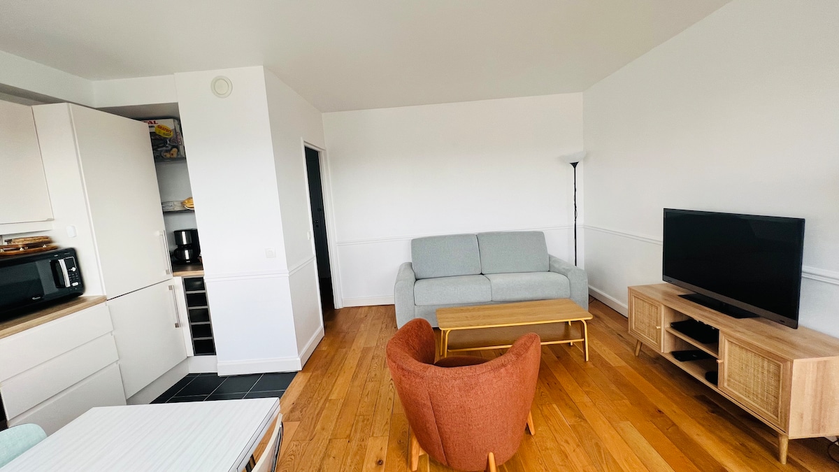 Appartement T2 situé dans le 19eme arrondissement de Paris, proche des Buttes Chaumont et du canal de l'Ourcq avec une vue imprenable sur le Sacré Coeur. Le logement est au calme et à proximité des métros ( lignes 2, 5, 12Bis, 7), vous pourrez également profiter des cinémas à proximité. Vous trouverez un supermarché au pied de l’immeuble. L’appartement est composé d’une entrée avec rangmemts, un salon avec canapé lit, une cuisine ouverte sur le salon et d’une chambre avec lit double.