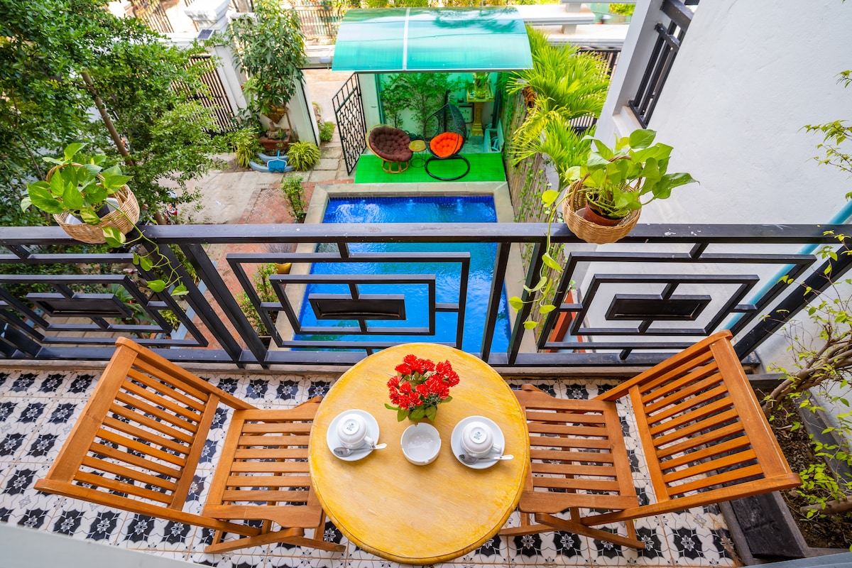 Villa artistique, unique et entièrement décorée à Siem Reap, Angkor La maison dispose de 4 chambres king-size, avec canapé, balcon donnant sur la piscine, piscine privée, salle à manger, coin salon, cuisine, parking et jardin. Il est situé à proximité des temples d'Angkor, du centre-ville et à 10 minutes à pied des restaurants, cafés et supermarchés. Chaque chambre est très grande, belle, avec balcon donnant sur la piscine, canapé, climatisation, ventilateur de plafond, bureau et salle de bain privée avec douche à l'italienne séparée, baignoire et toilettes