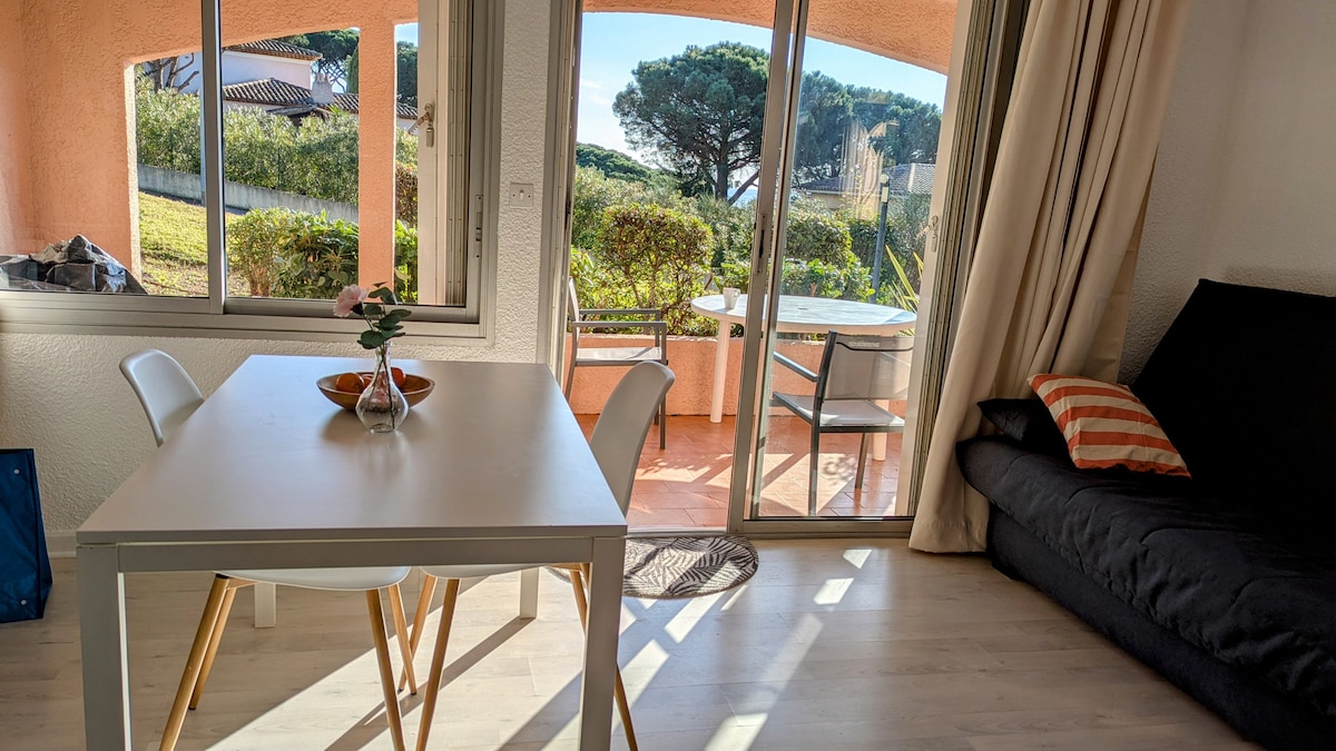 Appartement de 28m2 avec terrasse à 50 mètres de la plage. 1 chambre avec lit double 1 salon avec canapé convertible 1 salle de bain + WC indépendant 1 terrasse ombragée Serviettes et draps fournis. Logement Climatisé Animaux acceptés 1 place de parking privé avec barrière + parking public gratuit devant l'appartement Arrivée à partir 15h Départ à 10h N'hésitez pas à nous contacter ! Au plaisir de vous accueillir dans notre appartement sous le soleil !