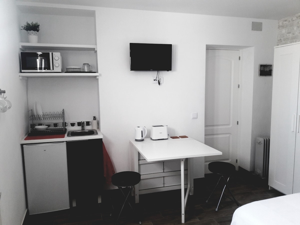 L'endroit idéal pour séjourner pour une courte visite à Cadix, pour les personnes qui veulent juste se reposer, se changer, manger dehors et profiter de la rue. La chambre est située au 3ème étage d'un immeuble du 19ème siècle, sans ascenseur et se trouve dans les ruelles. Il est très calme et lumineux et contient sa propre salle de bain et petit évier. Il y a un micro-ondes, un mini réfrigérateur, un grille-pain et une bouilloire. Wifi et Smart TV de 28 pouces. Il n'y a pas de salon ni d'équipements pour cuisiner de la nourriture.