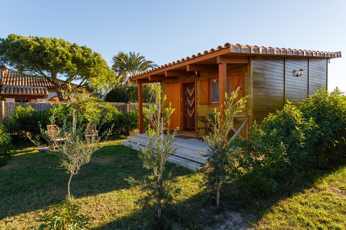 Cherry est rentré, le cerisier. Chalet en bois, le tout dans une seule pièce. Décoré dans un style rustique, simple et confortable avec toutes les commodités nécessaires. Zone calme à 200 m de la plage. Pour une ou deux personnes. Les animaux de compagnie ne sont pas autorisés et un seul enfant de plus de 4 ans par couple sera accepté. C'est un espace vert où il y a trois maisons avec jardin qui partagent la même terre pleine de petits arbres fruitiers ... Cerisier, noyer, caroubier, prunier, grenade, amande, pomme, orange, citron, pamplemousse...