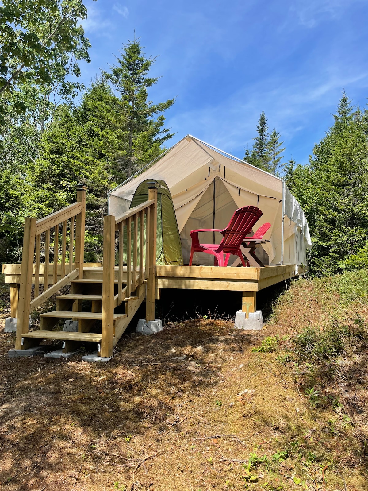 Découvrez la quintessence du glamping dans nos tentes Belle hors réseau, une retraite sereine à seulement 40 minutes de Halifax. Véritable expérience hors réseau : — Aucune eau courante, électricité ou fosse septique — Accès en gravier robuste de 1,5 km — Service cellulaire minimal et wifi : enregistrer les informations d'arrivée CARACTERISTIQUES DE LA tente : — Tentes chics et literie moelleuse — Cuisine extérieure avec barbecue — Cheminée intérieure Remarques : — Partagé : douche extérieure chauffée à l'énergie solaire. — Partagé : Portapotties bien aménagées. Découverte : — Accès au lac + planches SUP — Foyer personnel avec éclairage solaire