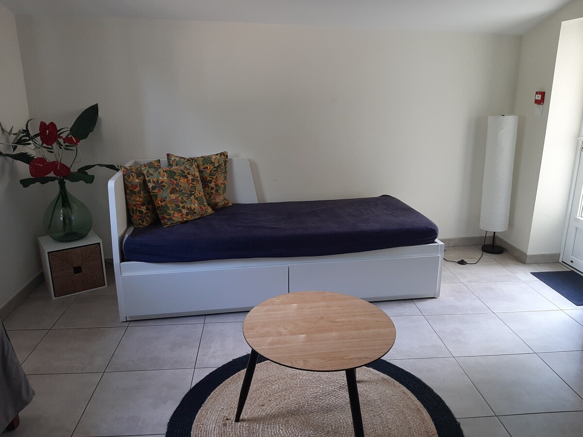 Studio indépendant situé dans notre maison, proche du centre et disponible du dimanche soir au vendredi matin, idéal étudiant en alternance ou travailleur en déplacement. Ce studio de 15m2, entièrement rénové est parfaitement équipé avec lit 140 cm neuf, salle d'eau ouverte (douche et WC), coin cuisine. Vous apprécierez notre logement pour son lit confortable et son indépendance. /!\ Logement STRICTEMENT non-fumeur, pas d'autorisation de fumer devant la maison.