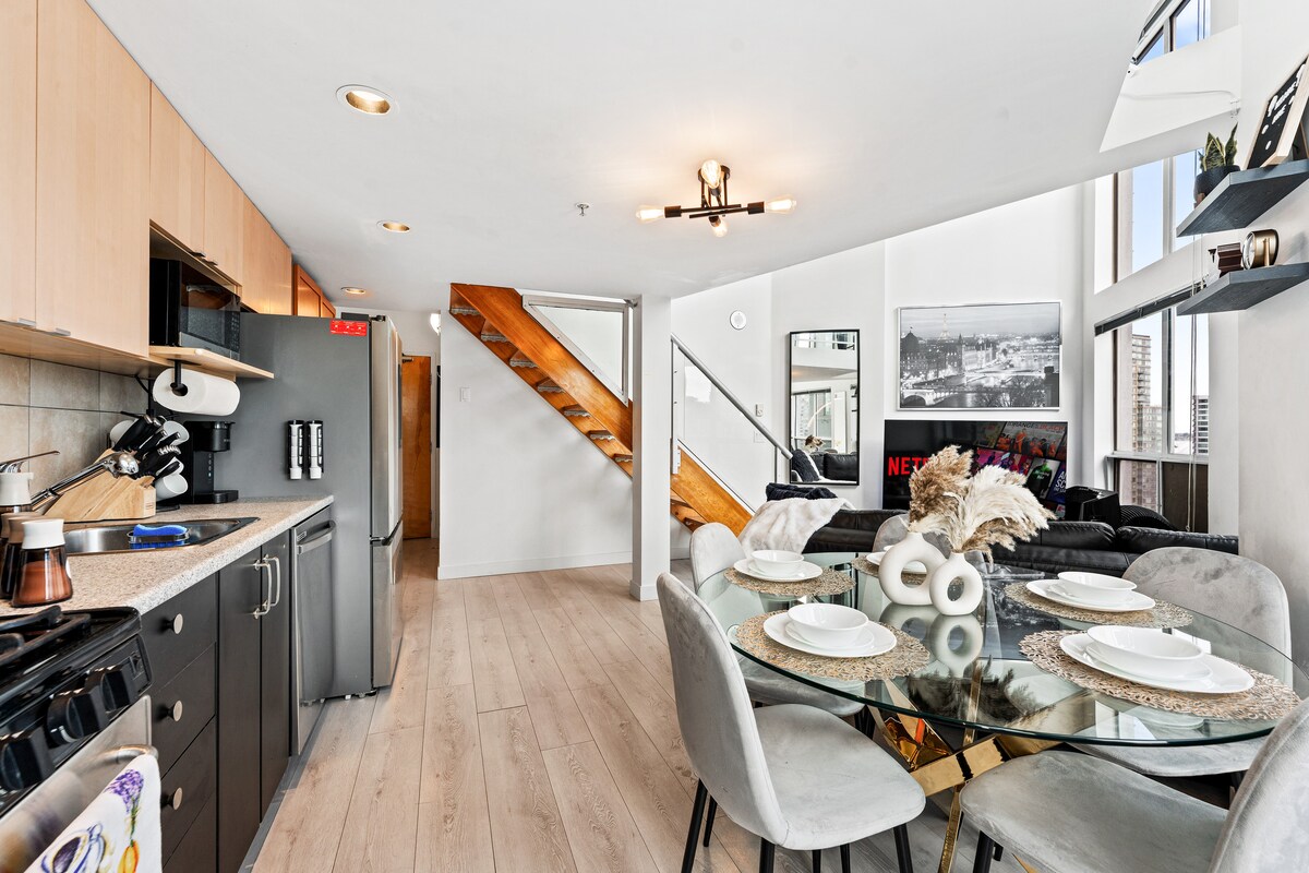Loft sur 2 niveaux au cœur du centre-ville de Vancouver. Juste à côté de la rue Granville et à 2 pâtés de maisons des commerces de Robson et du Skytrain. Nestors Market juste en face. Cuisine complète avec tout ce dont vous avez besoin, y compris une machine à café Bosch intégrée qui fera tout le café, latte, espresso que vous aimez. Le plus grand patio privé de l'immeuble avec table de feu et barbecue. Capacité d'accueil de 4 personnes et il y a une buanderie dans la suite. 1 place de stationnement pour véhicule et 1 place de stationnement pour moto.