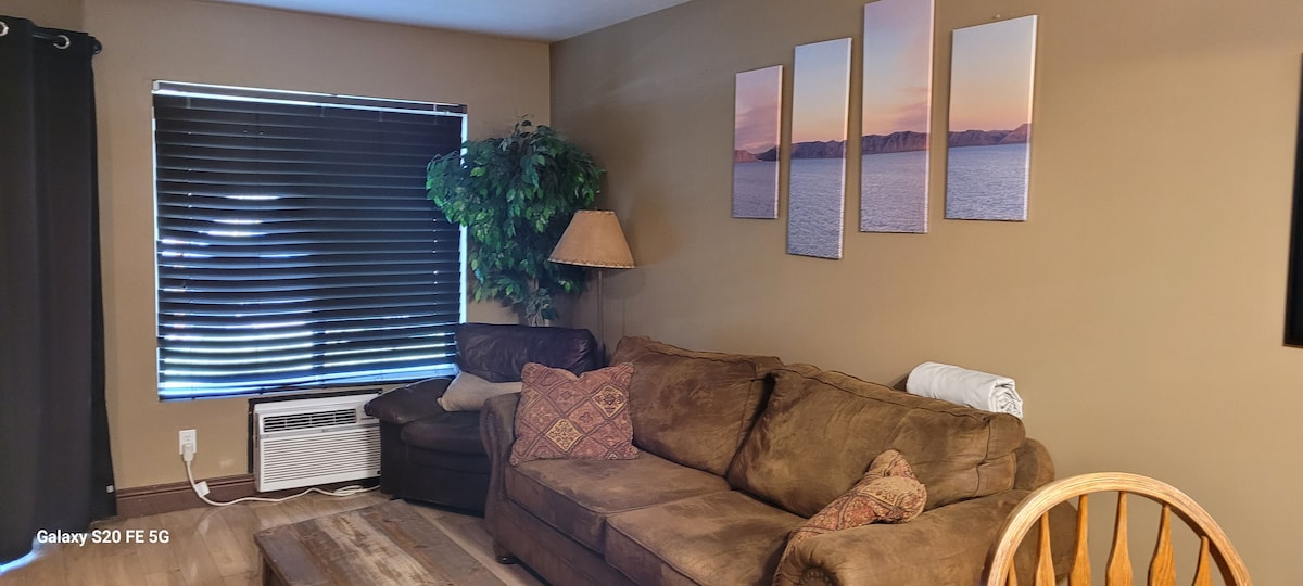 Magnifique appartement de 1200 pieds carrés prêt pour votre escapade relaxante à Bear Lake. Sur l'autoroute principale, en face de la marina de Bear Lake State Park. À quelques minutes en voiture ou à pied du centre de la ville, des restaurants et des légendaires shakes à la framboise ! Rez-de-chaussée avec seulement deux petites marches à l'extérieur pour négocier. Près de la piscine. La porte vitrée coulissante s'ouvre sur un patio et un espace herbeux commun. Dispose d'un barbecue au propane à votre disposition. Veuillez vous assurer sur les photos que les couleurs des murs et les meubles sont acceptables. Pas d'animaux de compagnie.