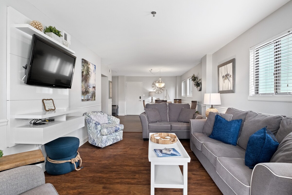 Have fun with the whole family at this stylish place. Sleeps 4 1 king size bed. And a queen pullout sofa ,Large swimming pool and a kiddee pool. MAY BE TO SMALL FOR 4 ADULTS IDEAL WITH 2 SMALL CHILDREN Beach front grille and bar as well as an ice cream shop . 3 restaurants on premises . Beautiful balcony with 2 tall chairs and table. With breathtaking view of the Atlantic Ocean. Tennis courts and pickle ball. Full fitness center .