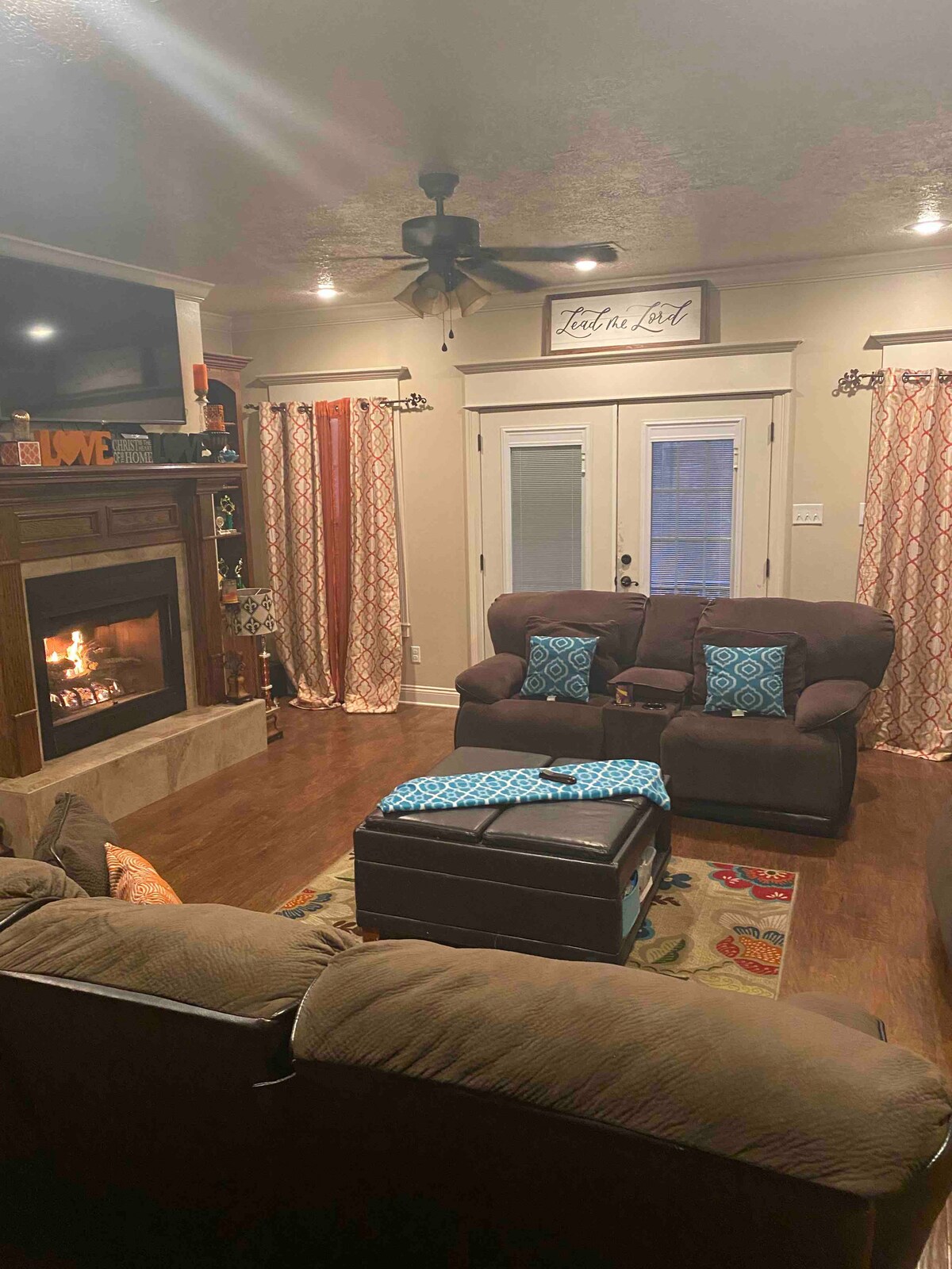 Our house sits on a quiet short street in town. It is a cozy, CLEAN, beautiful, three-bedroom, two-bath home, child-safe with closed in backyard. There is an electric fireplace. A bonus room can be used as a laptop friendly office space. A fully equipped kitchen contains basic appliances, Keurig, and more. Backyard has privacy fence/grill. Front door has Ring doorbell with audio/camera. Strong wifi throughout. Smart TV in living room. All bedrooms have blackout curtains, fans, chargers.