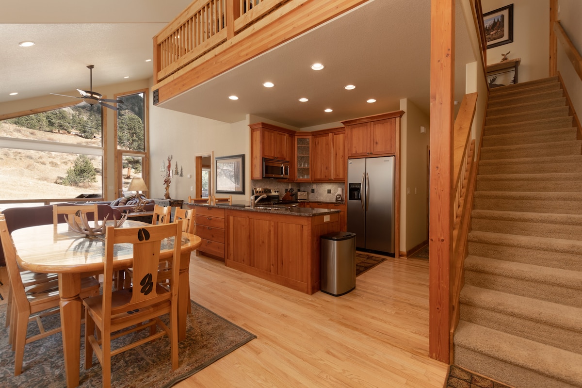 Plongez dans le jacuzzi et profitez des meilleures vues du Colorado à Reverie ! (Permis NCD-0063) Perchée près du sommet de Giant Track Mountain, cette maison offre des panoramas sur les hauts sommets du parc national des Rocheuses. Profitez de 2 espaces de vie, 2 terrasses, 4 chambres, une cuisine/salle à manger/salon ouvert avec cheminée. Détendez-vous comme jamais auparavant ! + Vues inoubliables + Jacuzzi privé + Bordure des terres du US Forest Service - la faune abonde ! + À 10-15 minutes de la ville et du parc + Barbecue, super cuisine Nouveau design en 2024.