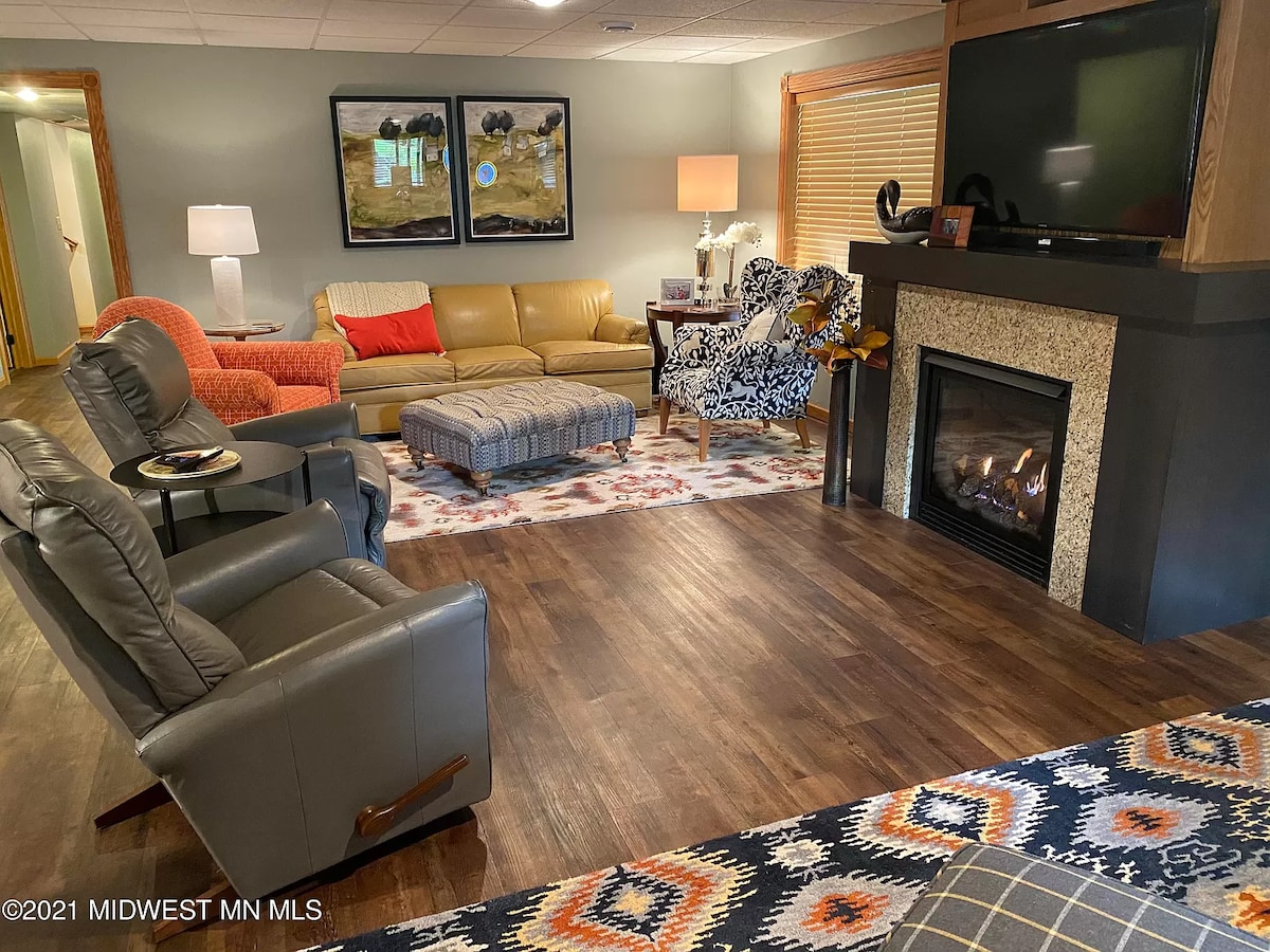 La vie sur le lac dans le Minnesota est géniale en toute saison ! Avec deux grandes chambres (troisième chambre disponible moyennant des frais supplémentaires), une cuisine complète, 3/4 salle de bain plus buanderie, vous aurez tout ce dont vous avez besoin pour une escapade formidable. Il y a une entrée privée, un patio et un barbecue, ainsi que des espaces partagés assez exceptionnels, y compris une grande plage de sable avec un filet de volley-ball, un foyer, un ensemble de jeux, des balançoires, des kayaks, un canoë et des paddleboards.
