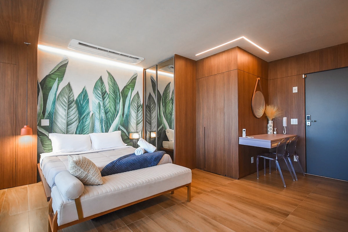 Appartement 44m Nascente Chambre : Lit Queen Size + linge de lit complet/Climatisation/TV 50"/Armoire/Rideau occultant/Coupe-lumière/Protection moustiquaire/Miroir Salle de bain : Sèche-cheveux Salle : Climatisation/Canapé-lit 1,38 x 2,12 m/Wifi 590mgbt/Tv 65"/Espace de travail + chaise/Table avec chaises pour les repas Cuisine : Réfrigérateur/Purificateur d'eau/Cooktop/Four/Micro-ondes/Air Fryer/Sandwicherie/Mixeur/Casseroles/Couverts/Fer et planche à repasser/Vaporeto Extincteur Balcon : Protection d'écran