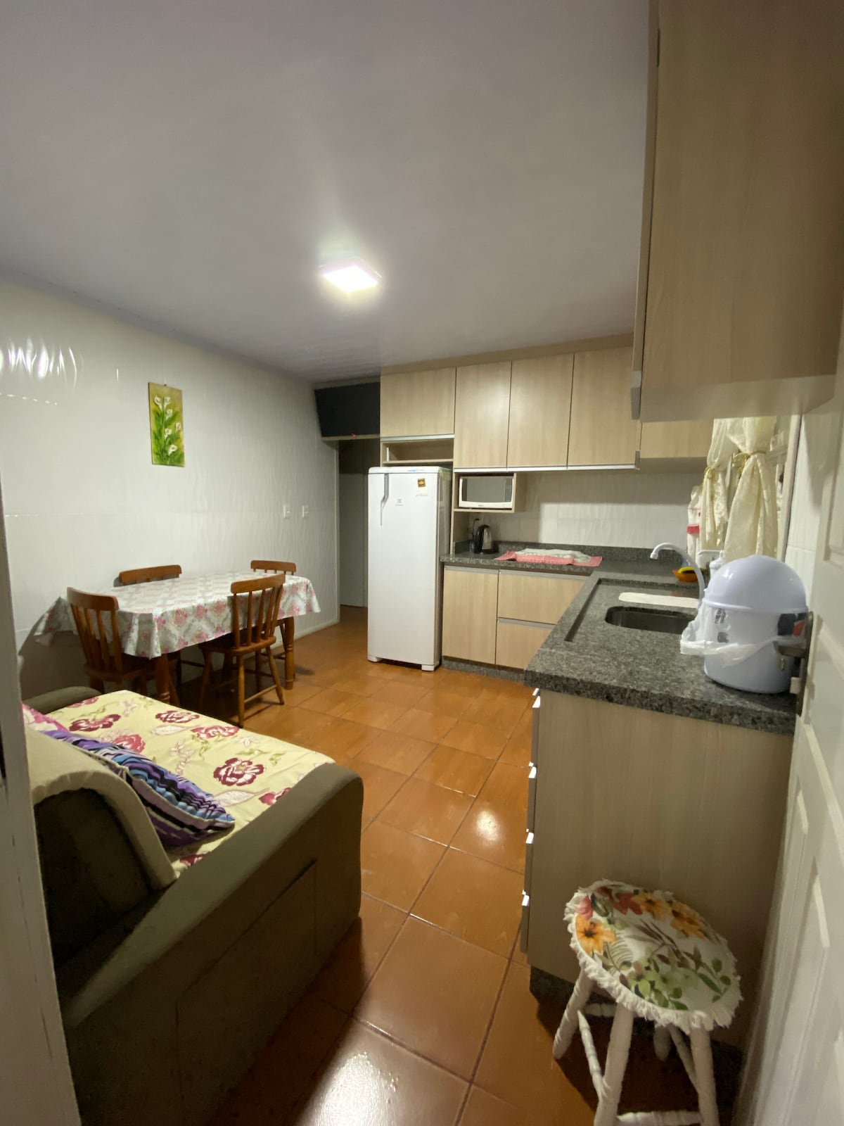 C'est un appartement privé qui se trouve au rez-de-chaussée, dans une cour avec d'autres pièces à louer où je vis avec ma famille. C'est un environnement calme et sûr. L'espace est à 500 m de la plage de Cal et à 500 m du portique de la plage de Guarita. L'appartement dispose d'une chambre avec un lit double + un canapé-lit simple, une salle de bains et une cuisine. Nous avons un parking SEULEMENT LA NUIT, dans une cour fermée et sécurisée, mais il n'est pas couvert. L'APPARTEMENT PEUT ACCUEILLIR JUSQU'À 3 PERSONNES, ENFANTS OU ADULTES.