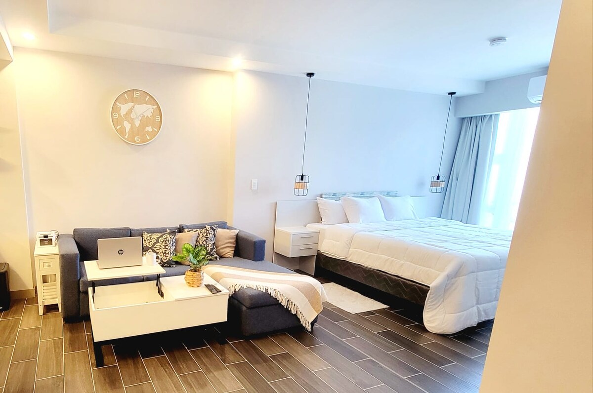 CR Stays vous accueille dans ce studio entièrement équipé à seulement 6,5 km de l'aéroport Juan Santamaría. Profitez d'une vue imprenable sur les montagnes d'Escazú, d'un lit King Size, d'un canapé-lit Queen Size, d'une connexion Wi-Fi rapide et de la climatisation — idéal pour 4 personnes. Le bâtiment dispose d'une salle de sport, d'une piscine, d'une terrasse avec barbecue, d'un cinéma privé et de salles de réunion. À quelques minutes des boutiques et des restaurants de la Plaza Real Cariari, et situé dans un centre d'affaires de premier ordre. Sécurité 24h/24 et 7j/7 pour un séjour sûr, élégant et confortable.