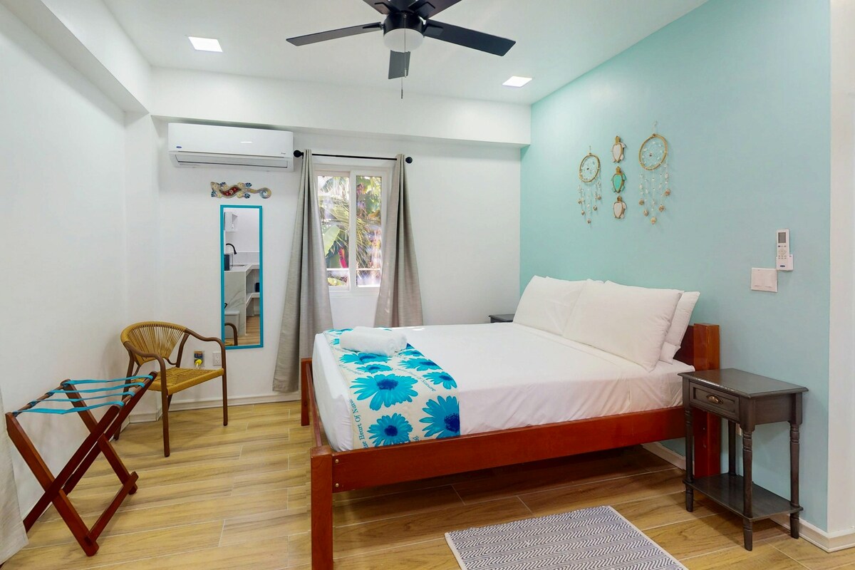 L'un des deux studios situés au niveau inférieur de notre maison. Spacieux et frais, situé sur notre propriété arborée dans un quartier résidentiel de Caye Caulker. Chaque unité dispose d'une cuisine complète, de la climatisation, de ventilateurs, d'un hamac, du Wi-Fi, d'un lit Queen Size, d'un futon, d'eau potable illimitée et de VÉLOS ! Barbecue et tables de pique-nique dans la cour qui est partagée avec nous et tout autre voyageur. Nous avons cinq locations sur notre propriété. Nous vivons sur place avec nos deux filles, deux chiens et deux chats.