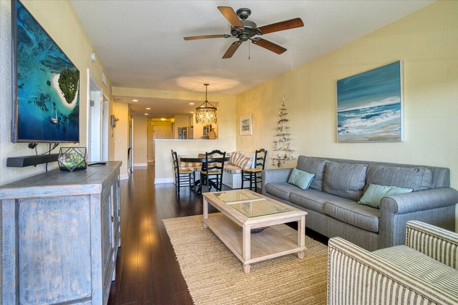 Completely remodeled luxury beachside condo with balcony. Water/beach view- balcony and living room. Short walk down to beach. Saatva Luxury mattress in Master. 2nd Bed- has double over double bunk bed with twin trundle. Couch -pullout bed that sleeps two more. Kid-friendly! Pack n play with memory foam mattress and diaper genie. Toys, child-proofing, kid utensils etc in unit. Beach supplies, towels, wagon, chairs, toys umbrellas.. below in storage. Paddleboard and bike rental available nearby!