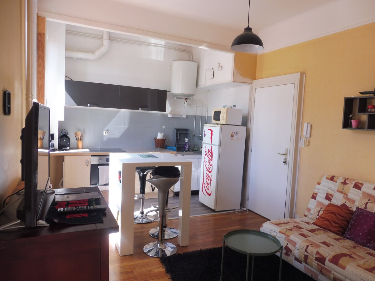 Appartement 3 pièces en RCH , refait à neuf, CENTRE VILLE dans une rue calme au stationnement gratuit, composé d'une cuisine équipée ( frigo-congel, plaque à induction avec four, micro-onde, lave vaisselle, lave-linge, cafetières normale et senseo) Une salle de séjour avec canapé convertible confortable, TV et salle à manger, salle d'eau (douche et wc), wc indépendant, Chambre1 avec lit 2 personnes, TV Chambre2 avec lit 2personnes+lit 1 personne Patio, internet, Animaux acceptés.