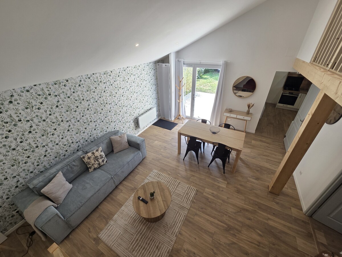 Maison rénovée de 48 m2 totalement indépendante. Agréable à vivre, tout y est pour se sentir chez soi. ne vous embarrassez pas... linges de lit et serviettes tout est prevue. La mezzanine est mensardee. Elle comporte de belles poutres. Nous avons mis un detecteur mais il faudra faire attention a votre tete. Une cour privative pour nos belles journées ensoleillées Le stationnement de votre véhicule se fait dans une cour privative