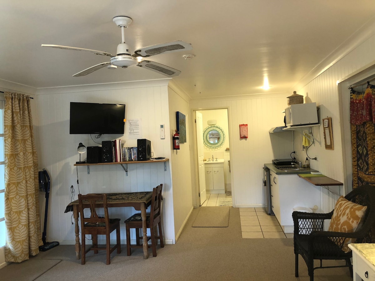 Le studio attenant à notre maison dispose d'une entrée privée. Il dispose d'un lit queen size confortable et d'une kitchenette bien aménagée avec thé et café fournis. Il y a un bureau, un canapé, une télévision à écran plat, le Wi-Fi et un port USB. Espaces de détente paisibles sur la véranda et dans le jardin. Logement idéal pour un couple ou une personne seule. Canton de Bellingen à 15 min à pied. Plage à 15 min en voiture vers l'est. Utilisation de la buanderie et de la piscine par négociation avec le propriétaire.