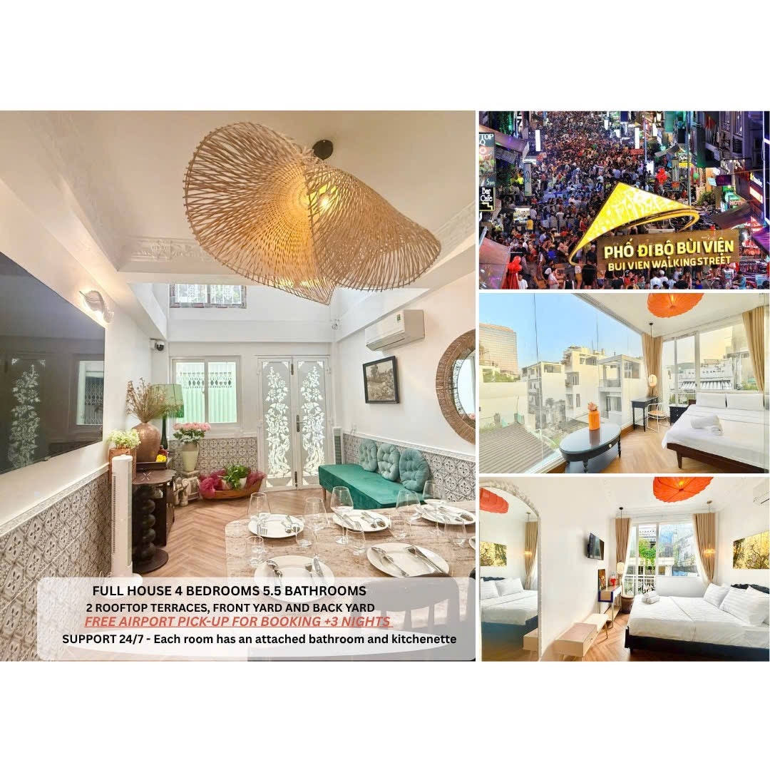Wellcome to BRAND-NEW house charmingly designed in Indochina style located in the high frequency of BUI VIEN walking street in D1, artistic style, resort facilities, spacious air-conditioned living room WHERE YOU CAN HANG AROUND UPTO 10 PERSONS in 2 large sofas and chairs. Windows, balconies and rooftop terraces have a panoramic view of the whole city. A unique, luxurious house in BUI VIEN walking street but nested in a short alley so there is no noise for caressing your peaceful sleep.