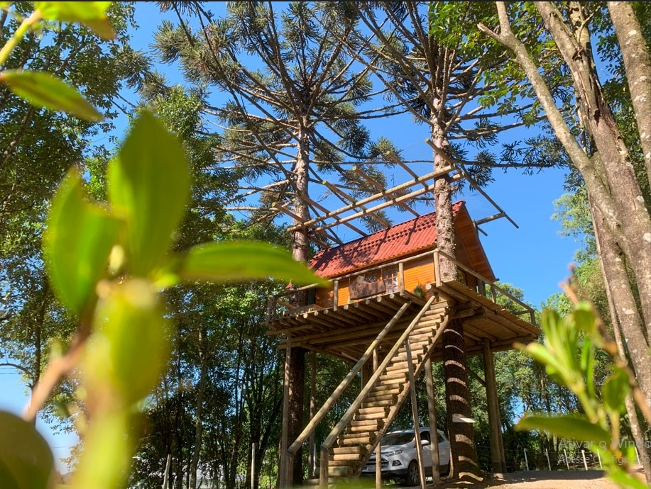 Uma casa na árvore construída entre 2 araucárias com mais de 50 anos, a cerca de 6 metros do solo, cada cômodo oferece uma experiência única. 🍃 🛀No deck há banheira de imersão com vista 🛏 Quarto no mezanino com vista para a copa das árvores e tv. 🚻 Banheiro com uma vista linda. 🚿 No box é possível tomar banho admirando bem de pertinho a araucária. 🍴Uma cozinha compacta com frigobar, microondas e louças. 🍽 Mesa de jantar com duas poltronas, vista da natureza e com ar condicionado.