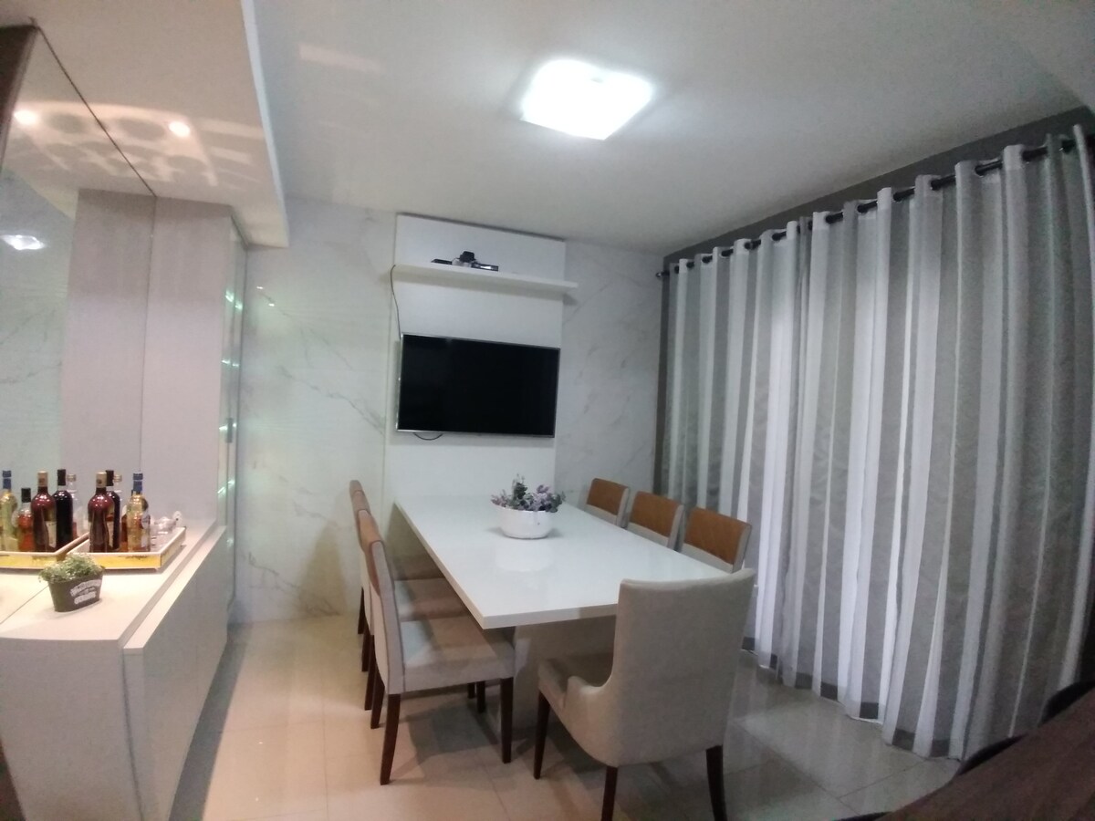 Nouvel appartement 1 chambre avec lit double et matelas queen size, Smart TV 32", climatiseur split de 9 000 Btu, armoires et banc pour prendre des notes. Cuisine avec plaque de cuisson, four encastré, micro-ondes, réfrigérateur et barbecue rotatif. Espace buanderie avec lave-linge séchant. Salon avec TV Smart 48" et canapé-lit pour 2 personnes. Chauffage au gaz dans la douche, la cuisine et les toilettes. Split 12 000 Btu dans l'environnement qui comprend la cuisine, le salon et la salle à manger. À proximité des sites touristiques Aurora et Maria Fumaça. Wi-Fi.