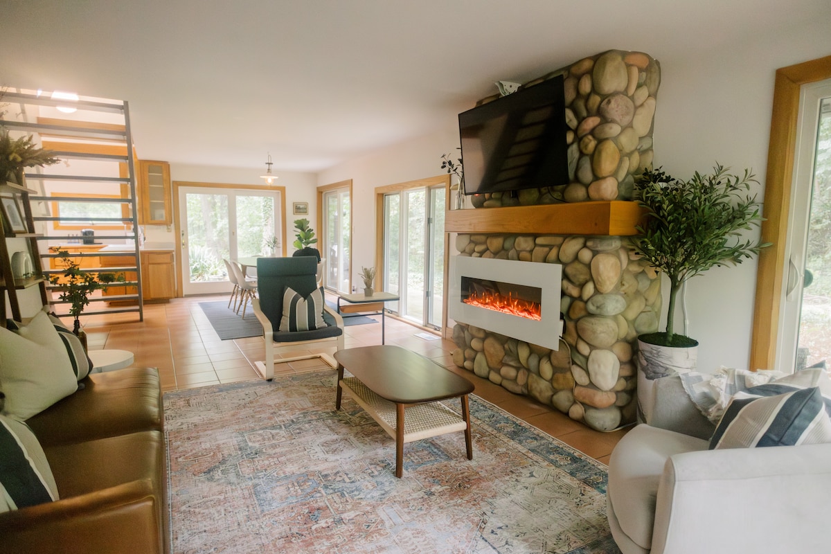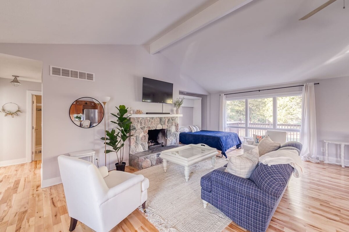 Bienvenue dans votre propre chalet à Harbor Country ! Escapade parfaite d'un week-end à Chicago, notre chalet est proche de Warren Dunes et à seulement 15-20 minutes à pied du lac Michigan. Rénové et joliment aménagé, il allie charme vintage et modernité ! Profitez du café du matin sur la nouvelle terrasse ou le porche protégé, plongez dans le nouveau jacuzzi ou installez-vous confortablement à côté de la cheminée à bois. Profitez de l'endroit idéal pour vous détendre, faire de la randonnée, faire de l'antiquité, déguster du vin et créer des souvenirs avec vos proches !
