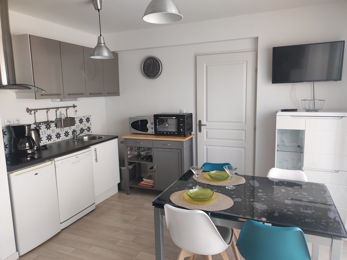Joli appartement lumineux de 30 m2, situé dans une résidence au 2ème, refait à neuf (02/22), à la déco moderne. Belle pièce à vivre, cuisine équipée. Logement pour 2/4 Pers (1 Ch avec avec lit 140x200 + convertible pour 2 personnes dans la pièce à vivre). Idéalement situé à 400m des plages et à 5mn à pied du centre ville. Arrivée autonome possible (digicode et boîte à clés). Oreillers, couettes, protèges matelas fournis, linge de lit et de toilette non fournis.