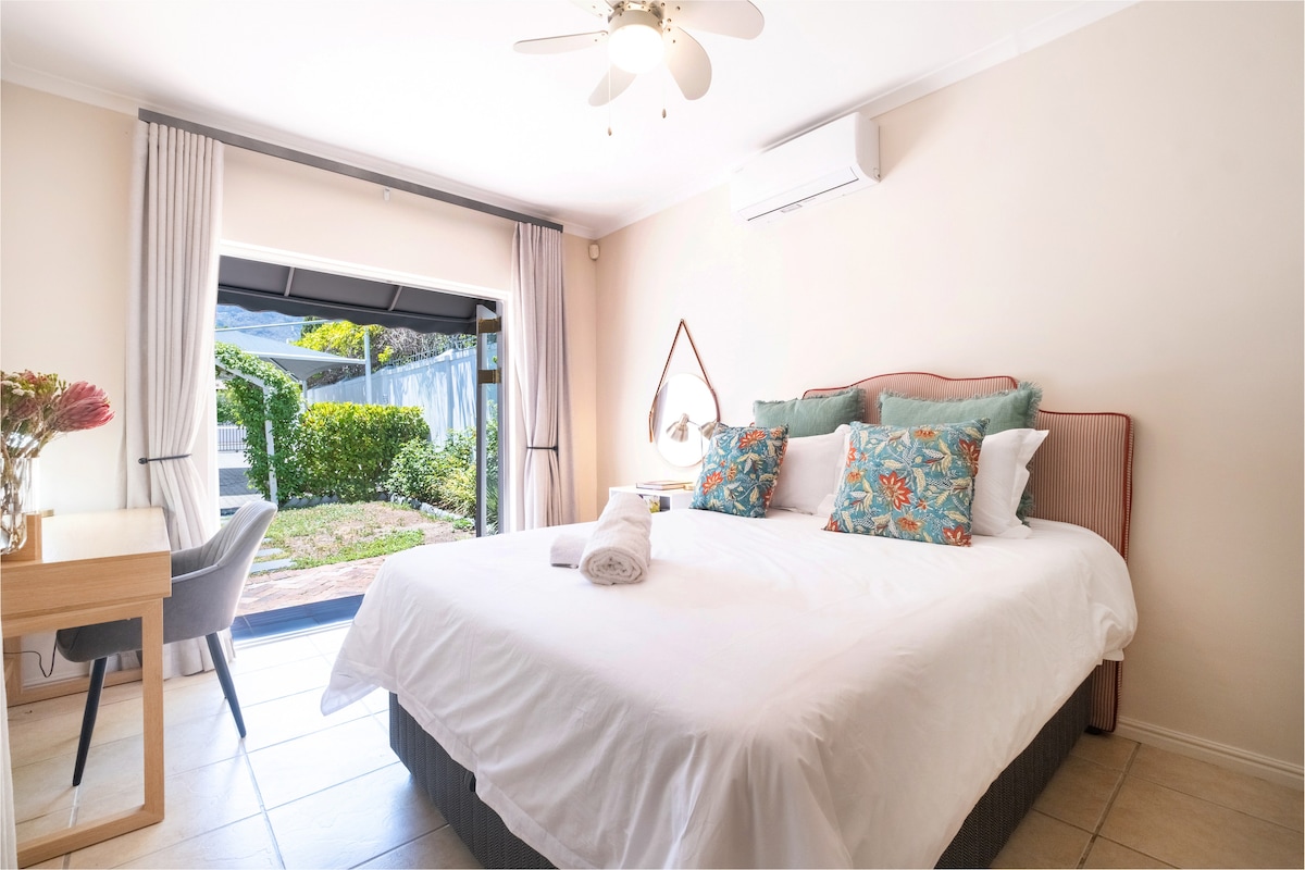 Belle suite de jardin situé dans un jardin paisible, est élégamment décoré avec une baignoire, salle de bains privative et douche. La chambre est entièrement équipée avec un générateur, TV, Wi-Fi, micro-ondes, couverts et vaisselle, thé et café Nespresso, climatisation, chauffage, sèche-cheveux, etc. La chambre mène à son propre jardin privé, où vous pourrez profiter de la vue magnifique sur les montagnes de Franschhoek. Profitez d'une baignade dans la piscine ou d'une partie de tennis ou de promenades dans les vignobles et la roseraie.