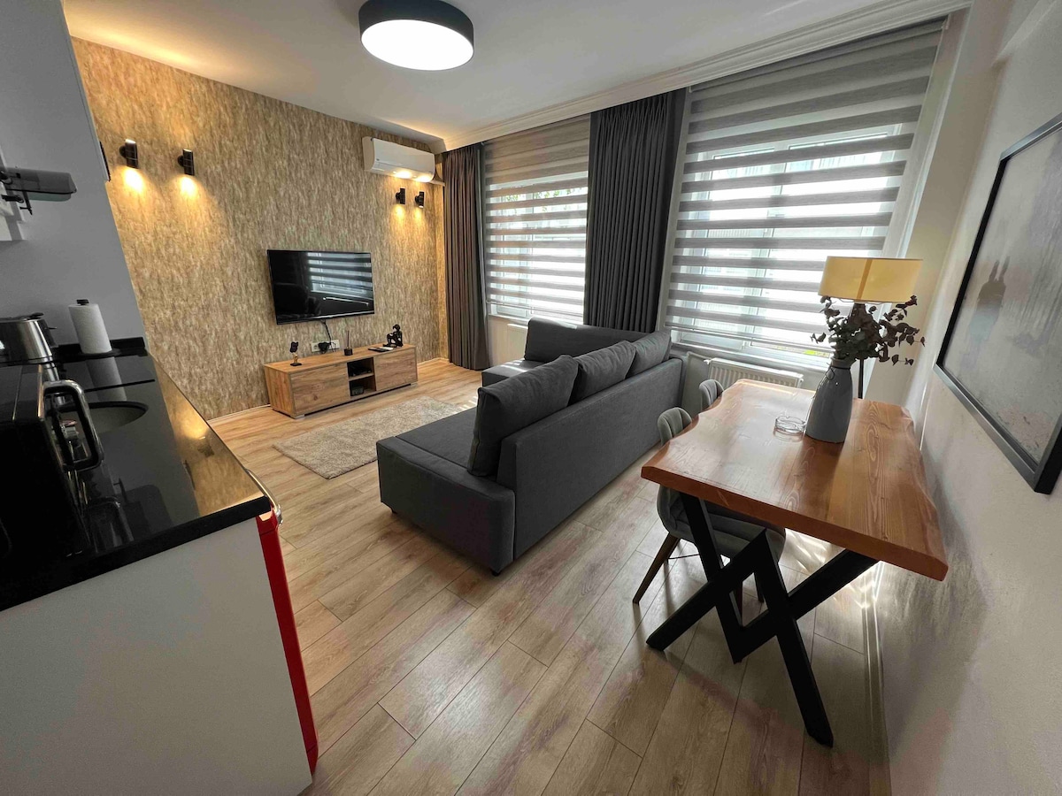 Le 01/09/2025, nous avons ouvert cette suite comme l'une des meilleures suites modernes au cœur de la région d'Ortakoy, à moins de 2 minutes à pied du pont du Bosphore. Avec une superficie de 60 mètres carrés, cette suite est idéale pour deux personnes ou un couple. Il dispose d'une chambre confortable et d'un canapé spacieux dans le salon élégant. Des meubles modernes et une décoration élégante créent une atmosphère spacieuse. Une grande fenêtre permet à la lumière naturelle d'inonder la pièce. Une cuisine entièrement équipée et une télévision intelligente garantissent un séjour confortable.
