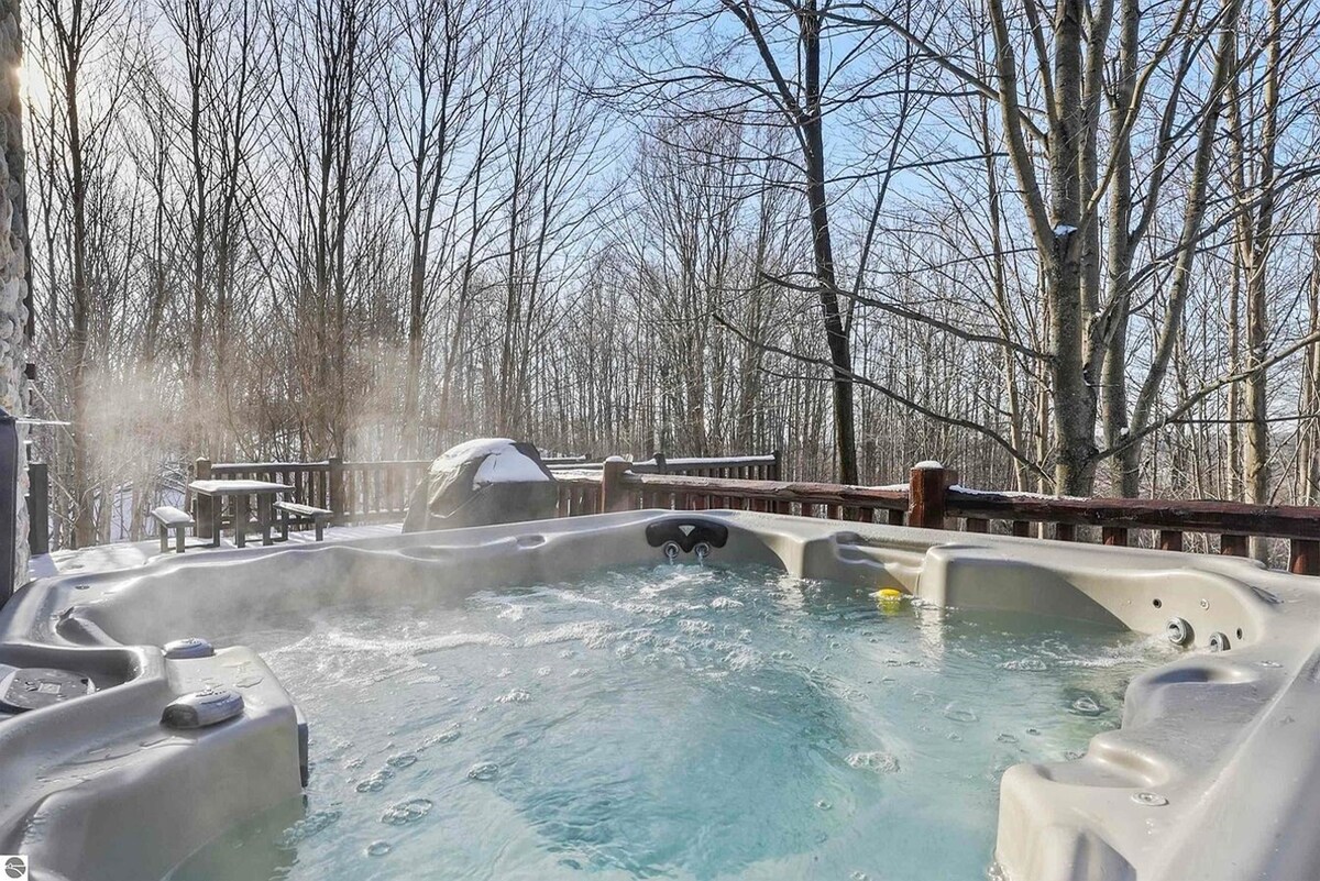 Le Hillside Hideaway à Crystal Lake est un luxueux chalet du nord du Michigan au sommet d'Eden Hill, juste à l'extérieur de la jolie petite ville de Beulah. Le chalet se trouve sur un terrain très privé, serein et magnifique entouré d'arbres. Ce chalet dispose d'une grande terrasse incroyable avec une vue saisonnière sur le lac Crystal à travers les arbres. L'immense terrasse privée dispose également d'un mobilier de salle à manger extérieur, d'un barbecue à gaz, d'une table de feu au propane et d'un charmant spa/jacuzzi privé ouvert toute l'année directement sur la terrasse !