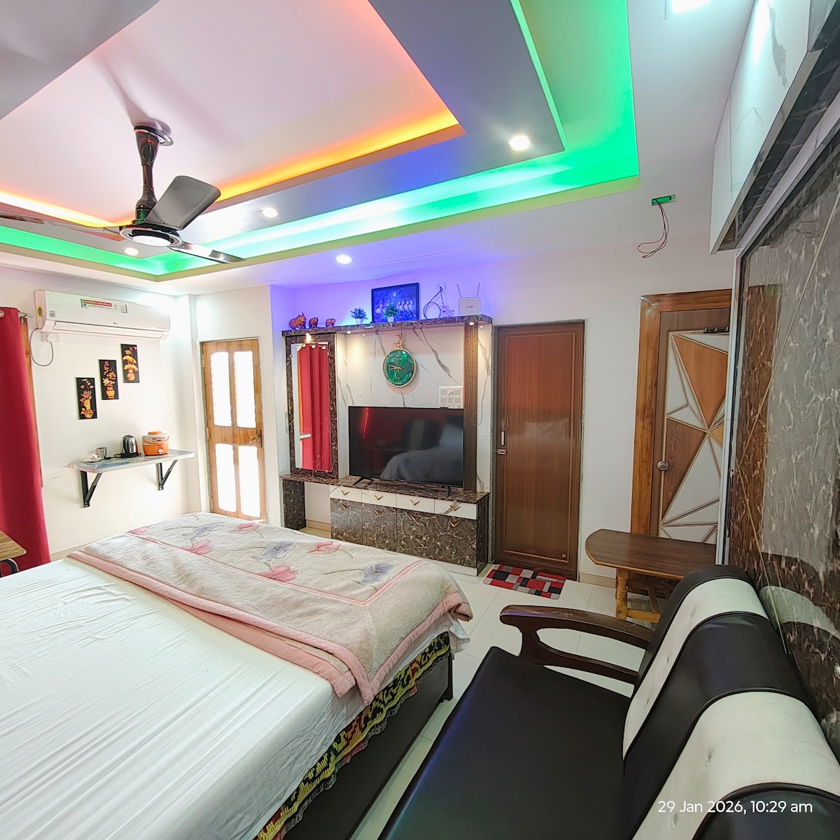 Profitez de notre séjour confortable entièrement meublé avec 2 BHK (2 belles chambres, un hall/espace de vie et une cuisine), avec : CARACTERISTIQUES DE LA - Entièrement équipé pour la restauration autonome - Tous les appareils et ustensiles nécessaires fournis - Idéal pour cuisiner et dîner - Réfrigérateur. - Purificateur d'eau/RO - Geyser Confort, divertissement et commodité - 1 grande télévision connectée LED de 56 pouces - Système de musique/de son - 1 climatisation avec 2 ventilateurs dans le salon - Canapé convertible dans le salon - Wi-Fi gratuit Spiritual Corner-Mandir/Pooja ghar