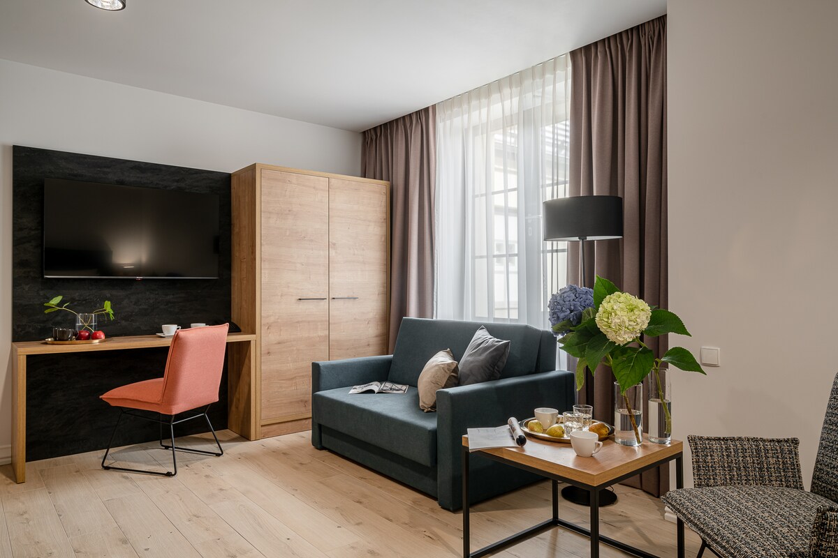 Klimatyzowany apartament z prywatnym wejściem obejmuje salon z rozkładaną sofą, oddzielną sypialnię z łóżkiem podwójnym oraz łazienkę z wanną i suszarką do włosów. Do dyspozycji gości jest aneks kuchenny z płytą grzewczą, lodówką, zmywarką i przyborami kuchennymi. Apartament posiada zestaw do parzenia kawy i herbaty, szafę, telewizor z płaskim ekranem oraz balkon.