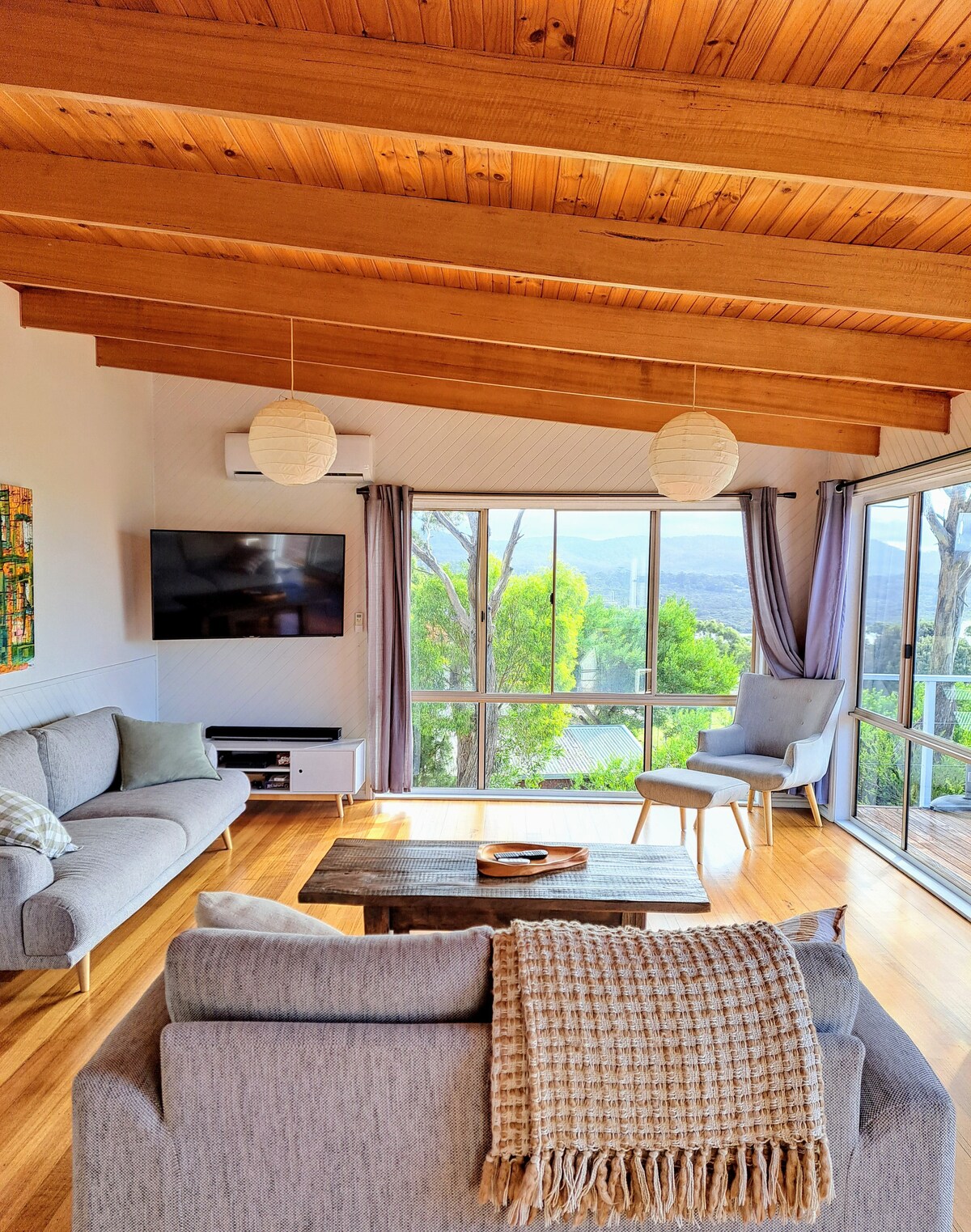 Notre famille profite des vacances à la cabane depuis plus de trente ans. Profitez de pièces à vivre spacieuses, d'un décor élégant, d'une vue sur l'eau et de nos jardins indigènes privés peuplés d'oiseaux. Détendez-vous dans le nouveau bain extérieur ou explorez la piste de brousse qui serpente jusqu'à une plage isolée au bord de la baie. Pas une autre cabane en vue. Beer Barrel Beach, le surf de Maurouard et les dunes de Peron vous attendent à St Helens Point à 8 minutes en voiture, tout comme les pistes de VTT. Il est temps de se ressourcer et de se détendre sur la côte de la Bay of Fires.