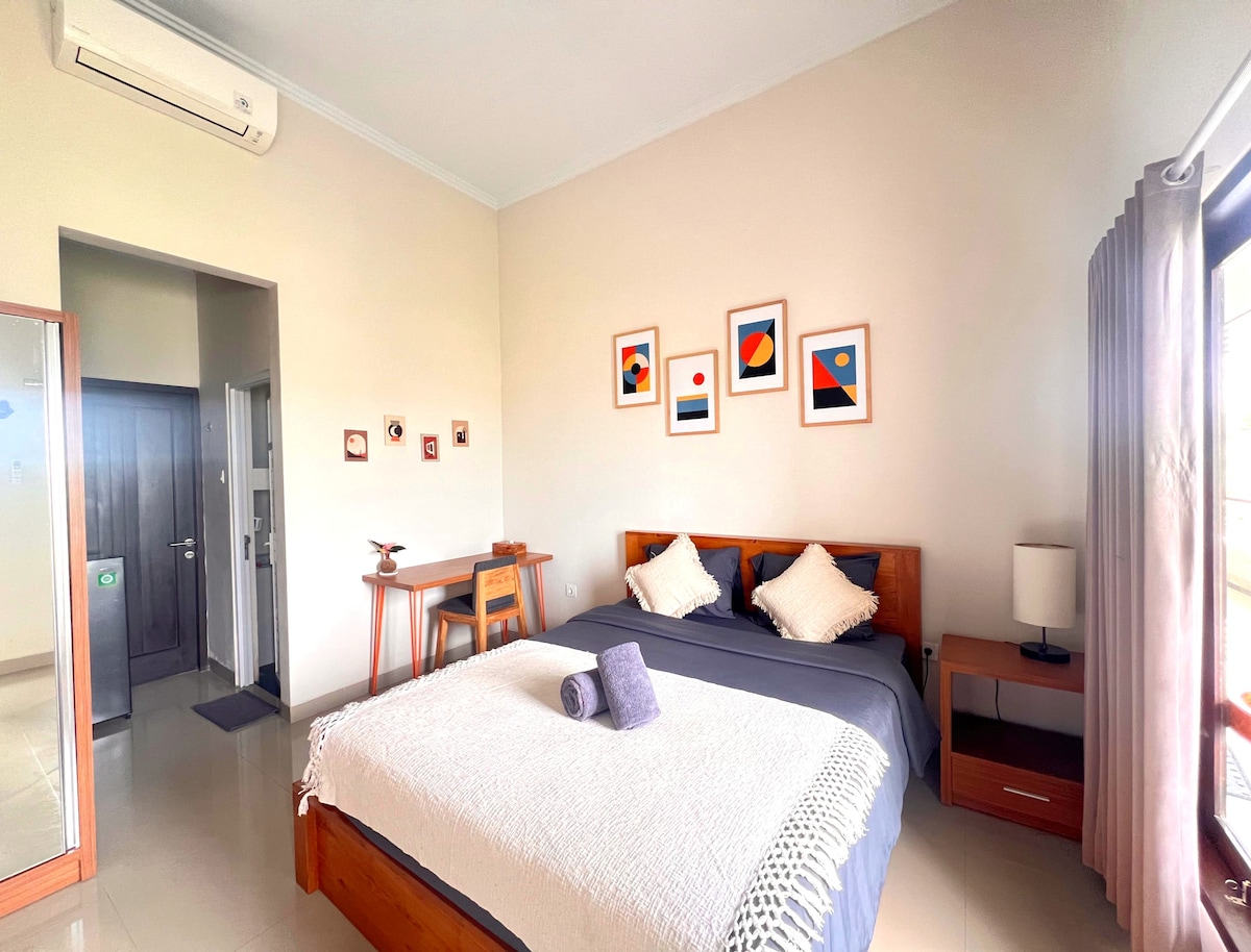 Calista Studios are comprised of 4 x 1 BR studios, situated side by side, each with their own unique style. Nestled in a peaceful Balinese neighborhood, this is a perfect retreat for creatives and travelers who appreciate the beauty in intricate details. With its 2 floors, the clever design maximizes functionality with a cozy, comfortable atmosphere, spacious king-size bed, fully equipped kitchenette, and a work-friendly nook that's ideal for writing, sketching, or planning your next adventure.