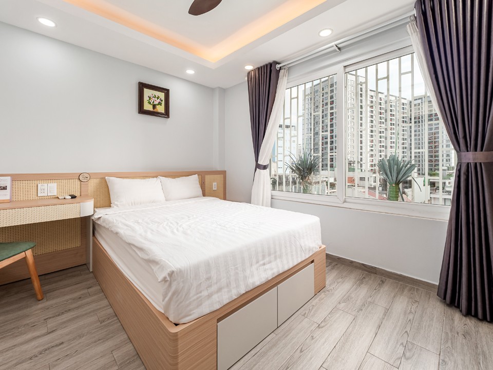Studio entièrement équipé de 34 m2 avec balcon 1 lit King Size avec matelas Dunlopillo confortable. Cuisine privée, salle de bain, réfrigérateur, télévision et autres commodités. Jardin extérieur Hôte parlant anglais et vietnamien, Internet 120 Mbps. Emplacement pratique : à 10 mètres de la route principale ; À 15 mn en taxi de l'aéroport, de la gare, de Notre-Dame. À 20 mn du marché de Ben Thanh, centre-ville. à 5 mn des centres de congrès tels que White Palace, Adora. À distance de marche des marchés, boutiques, restaurants...