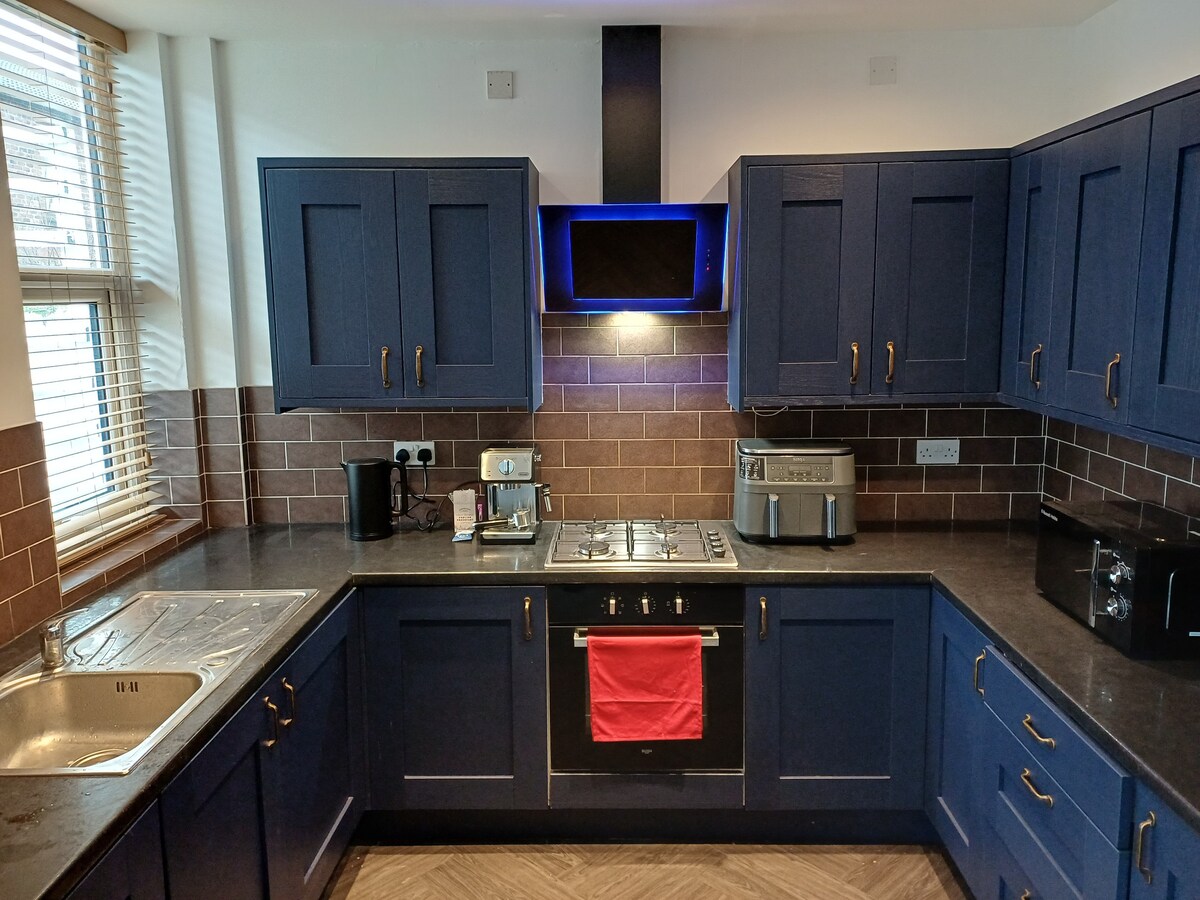 Récemment rénové en avril 2025. À seulement 5 minutes des services de l'A55, d'un McDonald's, d'un Subway, etc. Grande télévision 90'' de type cinéma dans le salon, télévision 65'' dans la cuisine, toutes deux avec BT/Sky Sports, Amazon Prime, Disney+, Netflix, et 2 canapés-lits doubles. Utilisation gratuite de la salle de sport du rez-de-chaussée, parking gratuit à l'extérieur de la propriété. Grande cuisine, 2 chambres au 1er étage avec un lit double et un lit simple, et salle de bain privative avec douche. Au 2e étage : 1 chambre avec un lit double et un lit simple, 1 chambre avec un lit double et des lits superposés, toutes deux avec salle de bain privative avec douche ou baignoire.