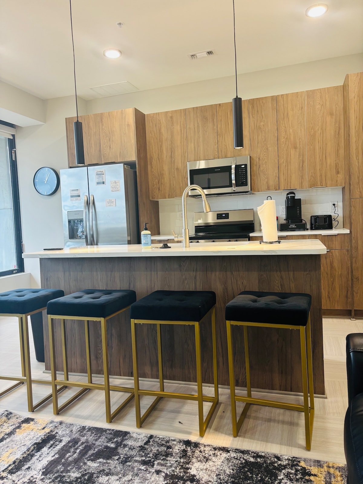 Profitez d'un confort moderne dans cet élégant appartement d'une chambre et d'une salle de bain avec deux téléviseurs à écran plat de 60", un lit king size moelleux et une douche en verre luxueuse. Restez frais avec un lave-linge/sèche-linge dans l'unité et commencez votre journée au bar à café et à thé gratuit. L'îlot de cuisine avec tabourets de bar est parfait pour manger ou travailler. Conçu pour la détente et la commodité, cet espace est l'escapade idéale pour tout voyageur.