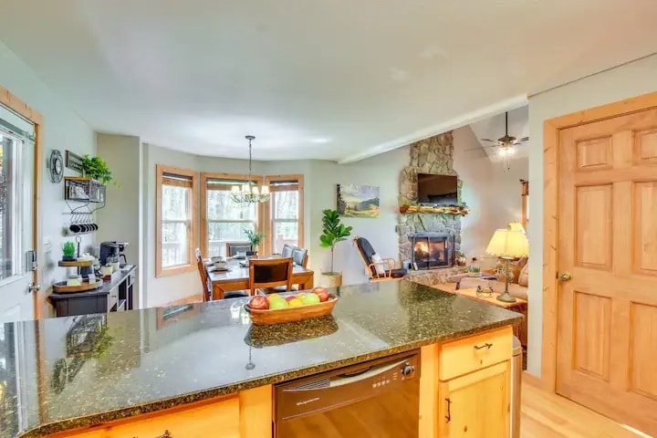 Entire lower level of lakefront home with private cove and dock. The lake is your backyard. Space includes three bedrooms (two with king-size beds and one with two twin beds) a large great room with fireplace, pool table, theater room, dining area, small but well-equipped kitchenette, 12x60 covered patio. Gas grill with side burner. During the summer season, you can rent our pontoon boat for $250 a day. You will need to reserve it in advance to make sure it is available.