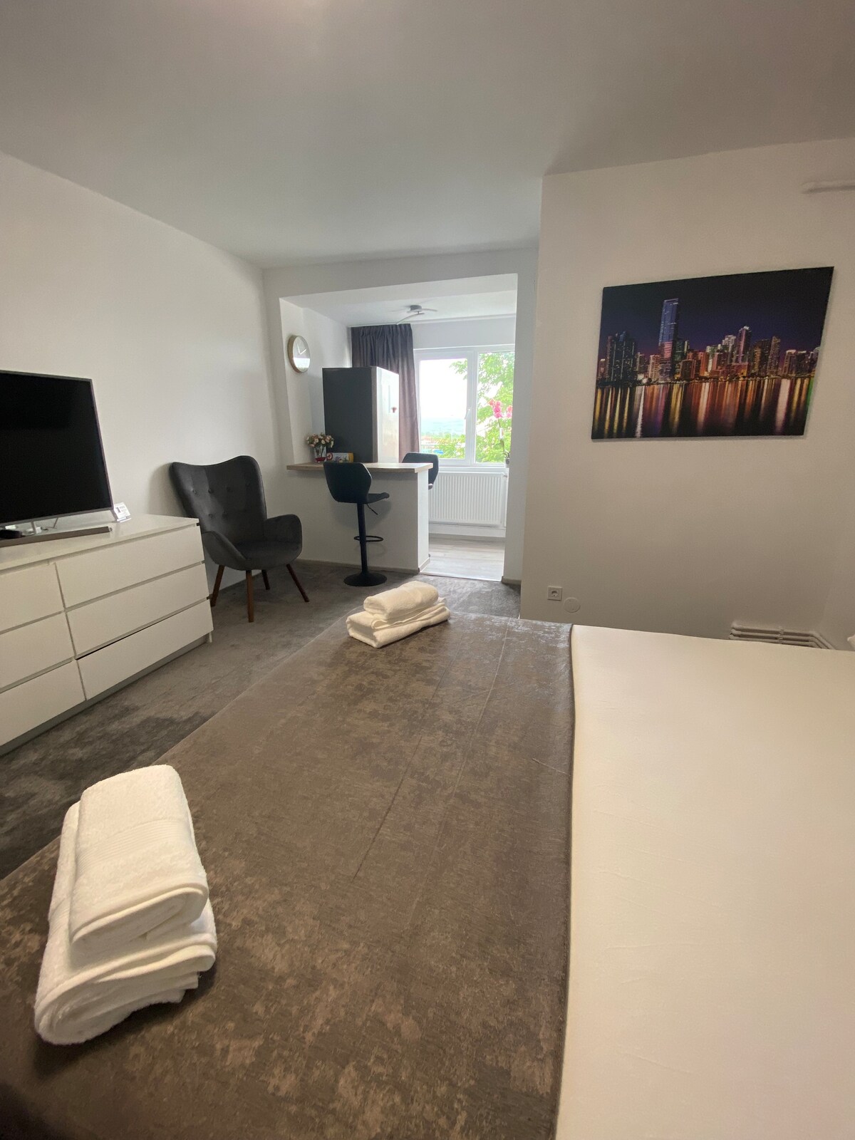 THE PLACE - studio indépendant avec une vue magnifique sur la forteresse médiévale. Situé au centre de la ville de Deva, ce studio vous offre le confort que vous avez toujours souhaité. Propre, élégant, intime ! Ce sont les attributs qui nous guident pour rendre votre séjour dans notre ville inoubliable. Les installations de la propriété sont les suivantes : - ascenseur - cuisine entièrement équipée (réfrigérateur, plaque vitrocéramique, hotte, lave-linge, four micro-ondes avec grill, machine à café, bouilloire, grille-pain) - salle de bain avec cabine de douche moderne (douche à effet pluie + douche flexible, sèche-cheveux, serviettes, gel douche, shampooing, savon liquide) - salon avec lit double king-size, matelas en mousse à mémoire de forme, canapé-lit (grande télévision LED connectée, Internet Wi-Fi gratuit, climatisation avec onduleur, éclairage LED, armoire, pantoufles, table et fer à repasser). L'emplacement est neuf et dispose de sa propre centrale thermique et de fenêtres à double vitrage qui assurent une isolation acoustique parfaite pour votre tranquillité. Café, thé, eau plate et minérale offerts par la maison. Sur demande, nous pouvons vous fournir un minibar payant. Nous sommes à votre disposition pour toute information : attractions touristiques, restaurants, lieux de loisirs.
