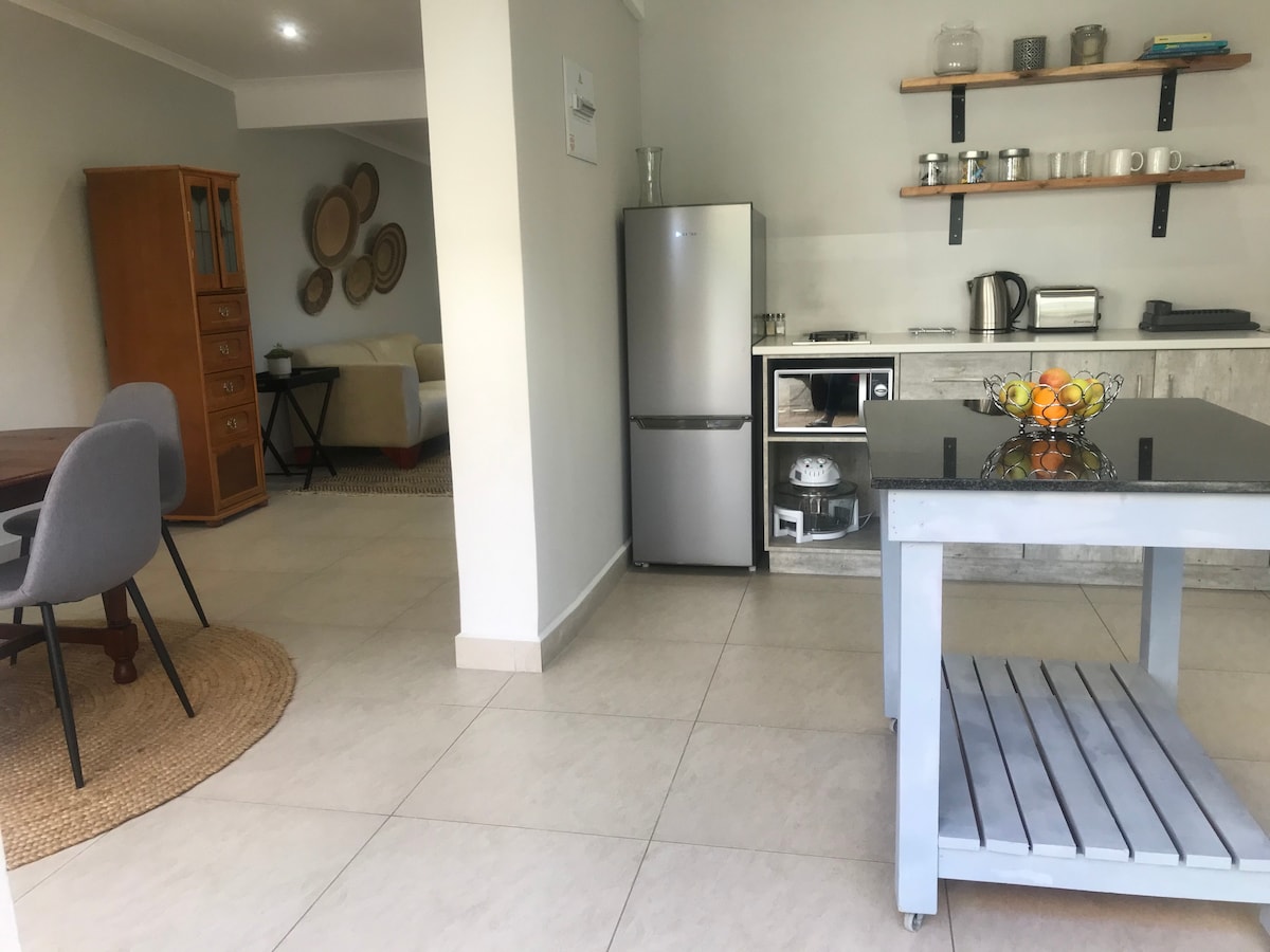 Créez des souvenirs dans cet endroit unique et spécial. Nous pouvons accueillir 2 adultes ou 2 adultes et 2 enfants. Les enfants sont les bienvenus. Nous disposons d'un lit King Size pour 2 adultes, d'un canapé-lit pour 1 adulte supplémentaire ou 2 enfants, et sur demande d'un lit bébé de camping. Braai disponible. Parking sécurisé sous des arbres luxuriants. Restauration autonome, avec plaque de cuisson à gaz, réfrigérateur et micro-ondes. Wi-Fi gratuit et télévision intelligente avec Netflix. Bureau pour travailler ou apprendre. Un logement relaxant pour tout le monde ! Proche du centre commercial, de la salle de sport, des restaurants et des écoles.
