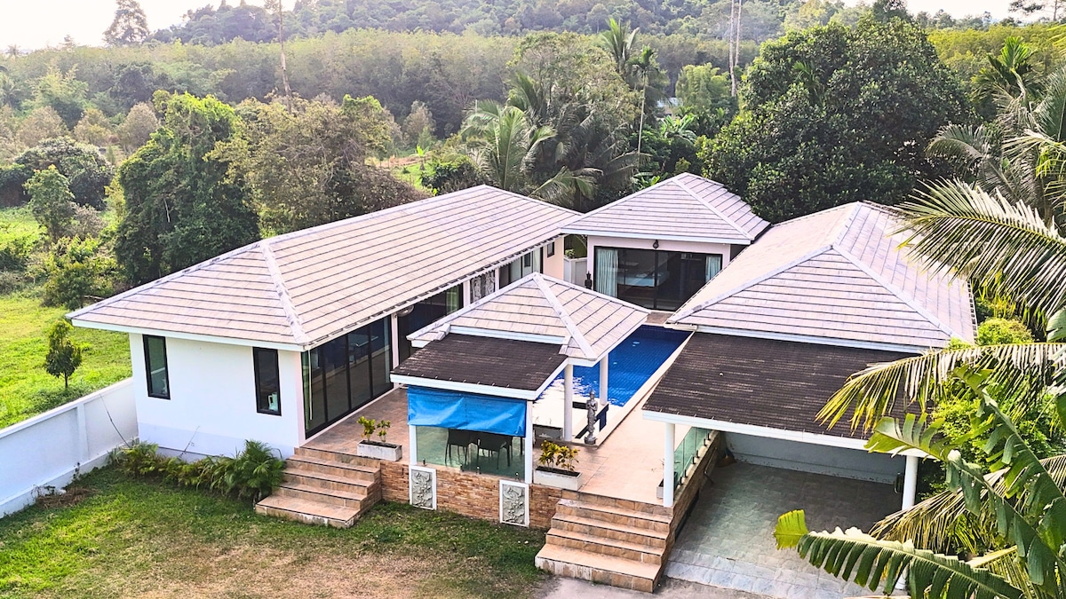 Dans le sud tropical de Samui se trouve la villa" Baan Suaan Kluay Mai"(jardin d'orchidées). Une villa moderne de 3 chambres à proximité de la mer avec sa propre piscine d'eau salée. À quelques minutes à pied de 3 plages. Toutes les charges sont incluses. Petit déjeuner sur demande. Faites un plongeon, détendez-vous simplement au bord de la piscine. Profitez de boissons fraîches tout en étant assis à l'ombre. Une villa où vous pouvez vraiment vous évader. Cuisine moderne complète. Vous n'aimez pas cuisiner ?Le village de plage de Thong Krut est à seulement 800 mètres, de nombreux cafés et restaurants.