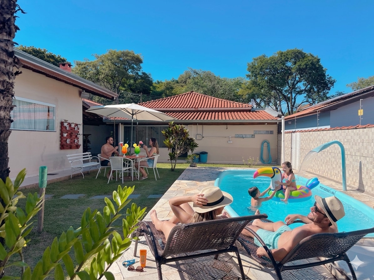 Casa Paraíso das Águas Quentes – Brotas À 5 min du centre-ville, avec piscine privée chauffée, 3 chambres avec salle de bains privative et climatisation, Wi-Fi et espace gastronomique avec barbecue. Garage pour 2 voitures, cuisine équipée (cafetière, friteuse, etc.). Parfait pour les familles et les groupes à la recherche de confort et d'intimité. Nous acceptons jusqu'à 2 petits animaux. Arrivée à 16 h | Départ à 11 h Pour votre confort, l'arrivée se fait via une serrure électronique. Tout est prêt pour des jours de repos et de plaisir !