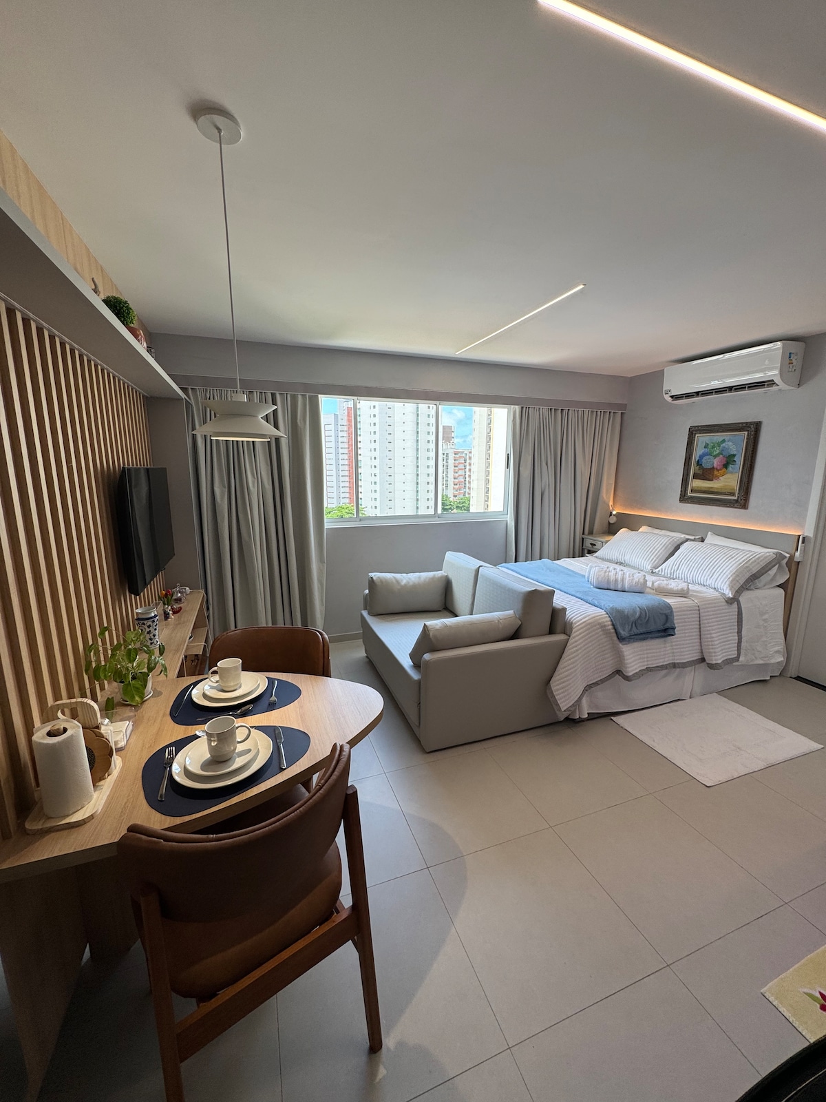 Cet endroit unique a son propre style. Parfait pour ceux qui vont travailler ou profiter de quelques jours à Recife. Très bien situé, à proximité de la plage, des principaux centres commerciaux, restaurants, boulangeries, cafés, etc. Notre appartement dispose d'un lit queen size confortable et d'un lit supplémentaire. Linge de lit haut de gamme. Télévision 50'. Internet. Cuisine bien équipée. Une table confortable pour les repas ou pour travailler. Immeuble avec parking, buanderie, coworking, espace gourmet, piscine, jacuzzi, salle de sport.
