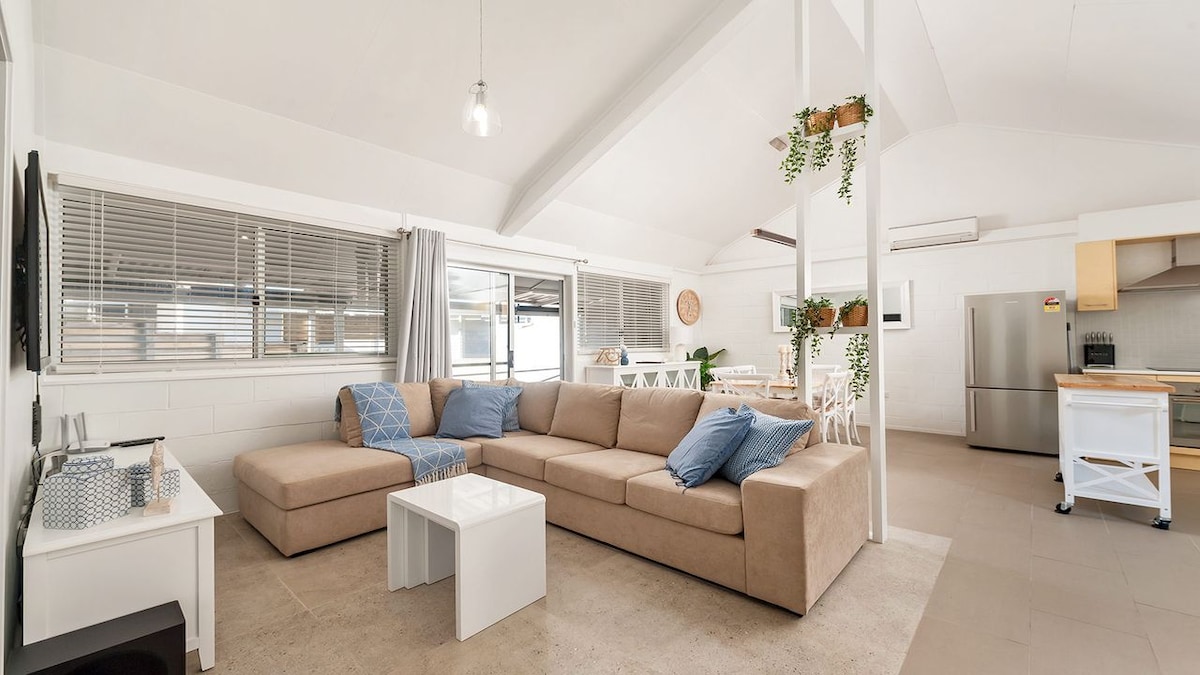 Ce logement affiche un style résolument unique. Plage moderne industrielle, décorée avec amour. Parfait pour les couples, les familles et les amis offrant l'un des meilleurs équipements de Fingal Bay. Non seulement relaxant et paisible, mais parfait pour quelques jours de vacances... et vous voudrez réserver à nouveau pour rester plus longtemps ! Cette propriété est unique pour son style moderne, son atmosphère détendue et ses vues privilégiées. Essayez et vous voudrez acheter, vous ne serez pas déçu. Veuillez noter que le logement est au niveau inférieur de la maison uniquement.