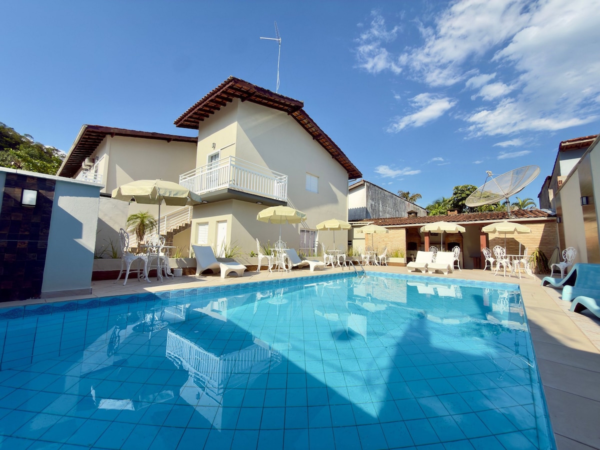 La nouvelle aventure de Maresias Beach ! Profitez de la nature près d'une réserve de forêt indigène tout en profitant des équipements : piscine avec bar, 2 barbecues et four à pizza. Avec Internet haut débit. Ambiance familiale, à seulement 5 minutes de la plage, avec concierge 24h/24. 1 emplacement pour votre voiture. Votre animal de compagnie est le bienvenu. Enregistrement simple via mot de passe. Arrivée flexible à partir de 15h Départ jusqu'à 11h